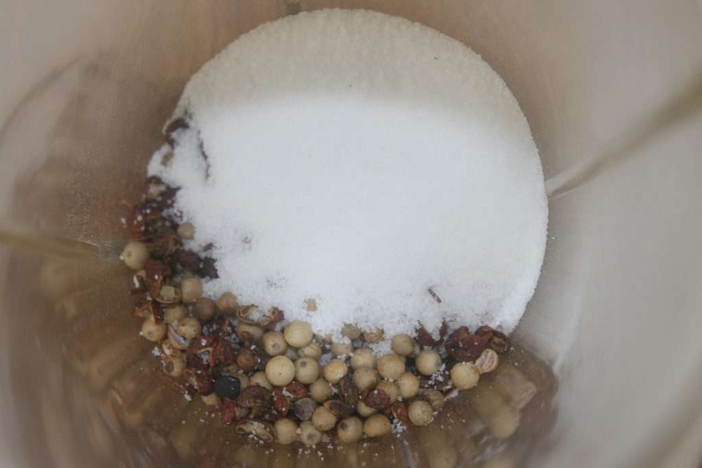 - Saupoudre avec une cuillerée à soupe du mélange poivre de sichuan, poivre blanc et sel.