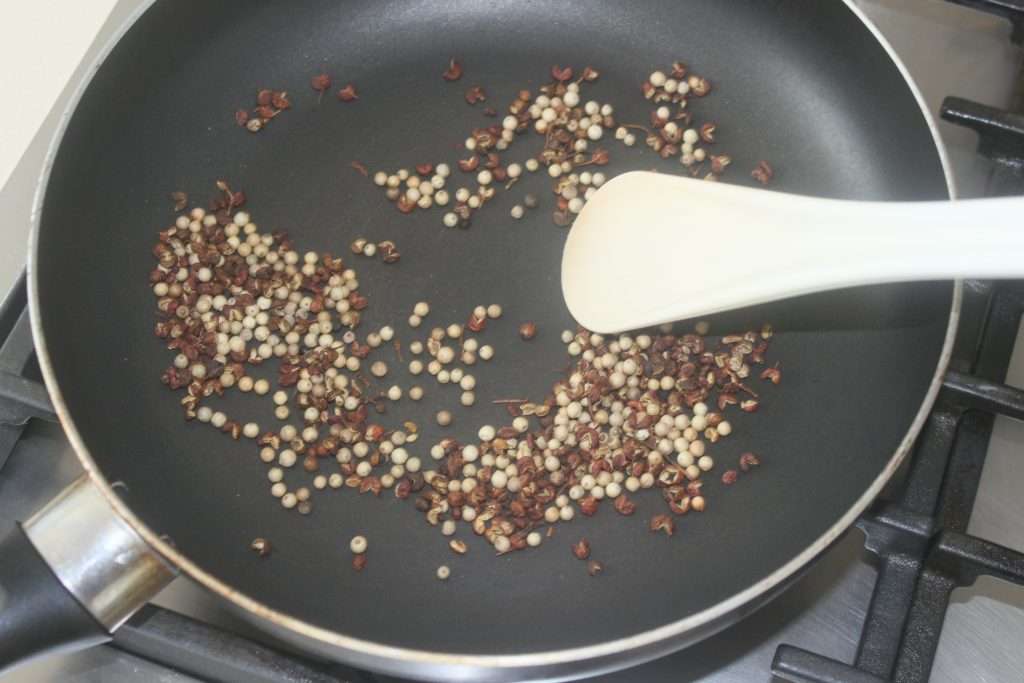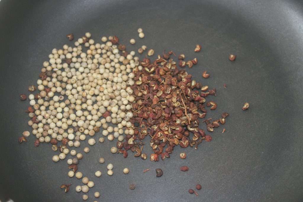 - Mettez tout d’abord le poivre de sichuan et le poivre blanc dans une petite poêle sur feu modéré et faites griller légèrement le tout.