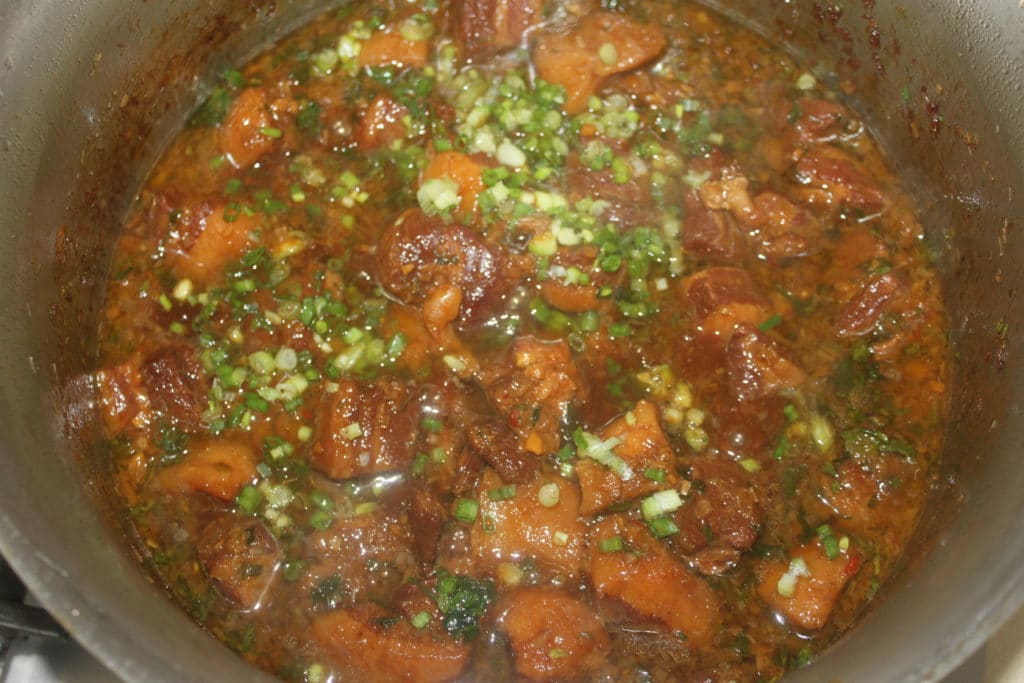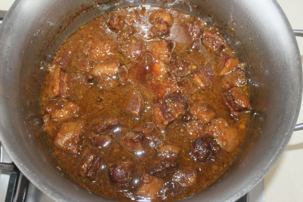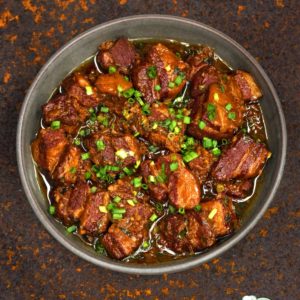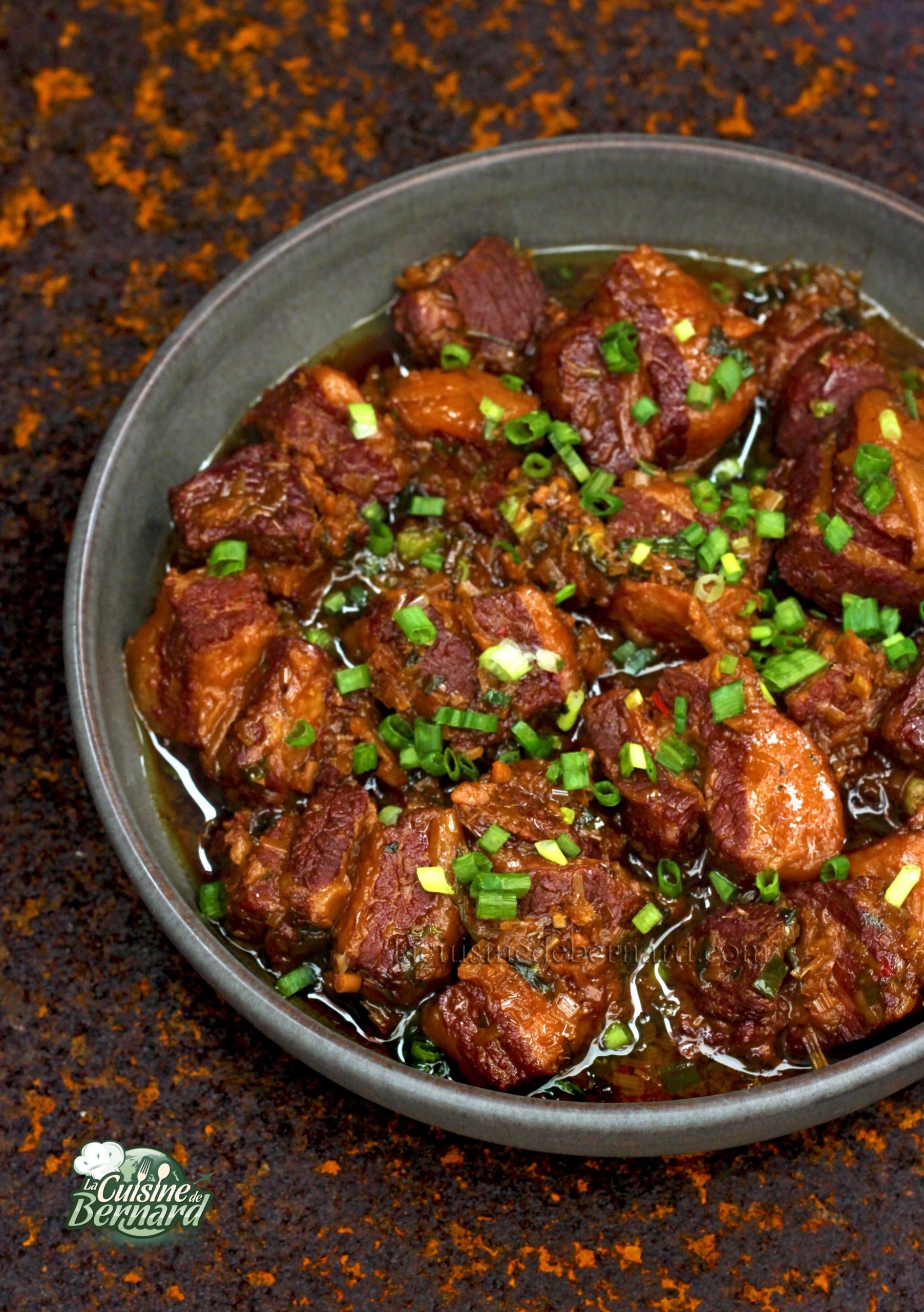 Je fais souvent ce plat lors de mon atelier de cuisine vietnamienne. Ce n’est pas exactement le porc au caramel très traditionnel, car les ingrédients diffèrent un peu. La sauce est extrêmement savoureuse. Il y a dedans plein d’ail, de gingembre et de citronnelle et surtout un vrai caramel maison. Un délice avec un riz blanc nature. J’ai fait plusieurs tentatives avec des viandes moins grasses, mais c’est bien meilleur avec ce que je vous propose comme morceau. C’est riche et bon, mais on ne mange pas cela tous les jours non plus… ????