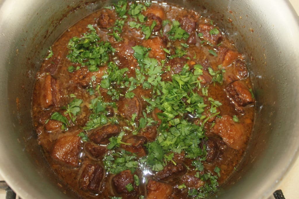 - Au bout de 3h-3h30, la viande doit être extrêmement tendre. Si la sauce est trop liquide, laissez-la s’évaporer de nouveau et si la sauce est trop réduite, ajoutez un peu d’eau.