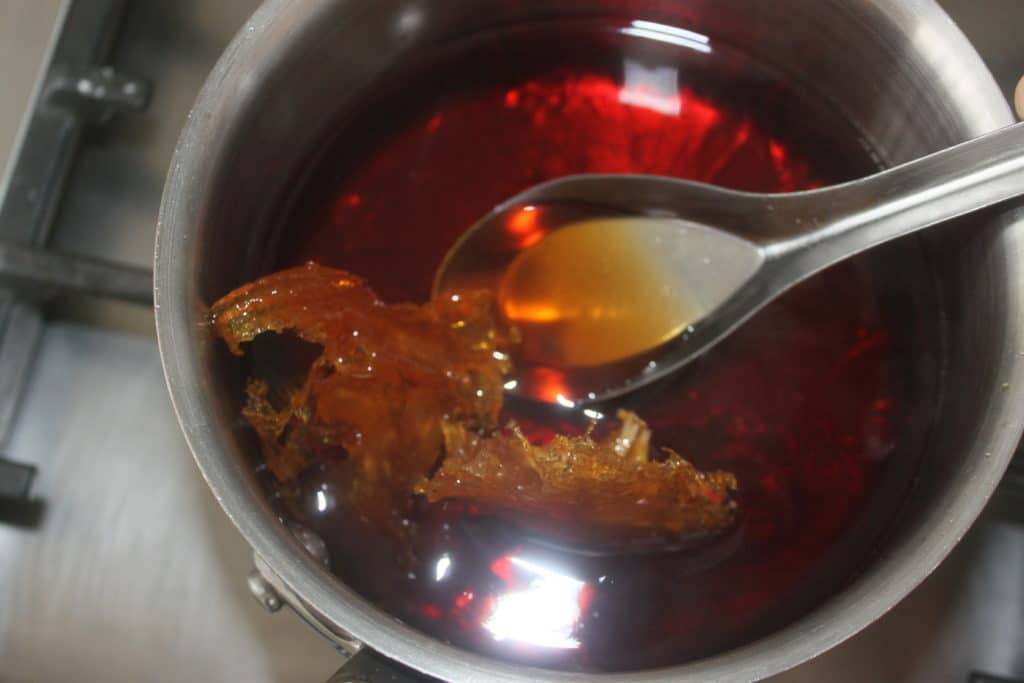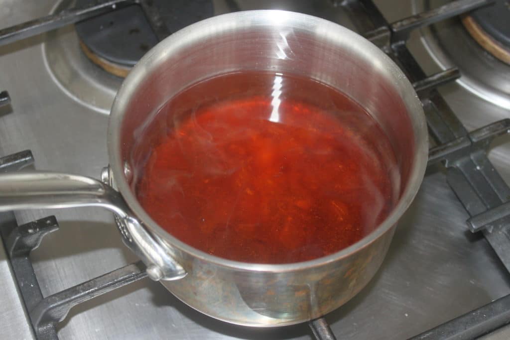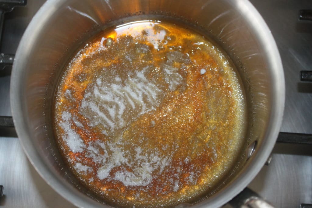 - Ajoutez une troisième cuillerée à soupe, laissez fondre et caraméliser et ainsi de suite pour les 7 cuillerées à soupe. Quand le caramel est bien ambré sans être brûlé, versez de l’eau dans la casserole. Mettez-en une bonne quantité puis laissez le caramel se dissoudre sur feu doux.