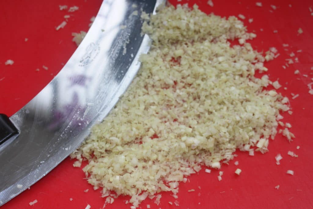 - Épluchez la tête d’ail et hachez menu les gousses.