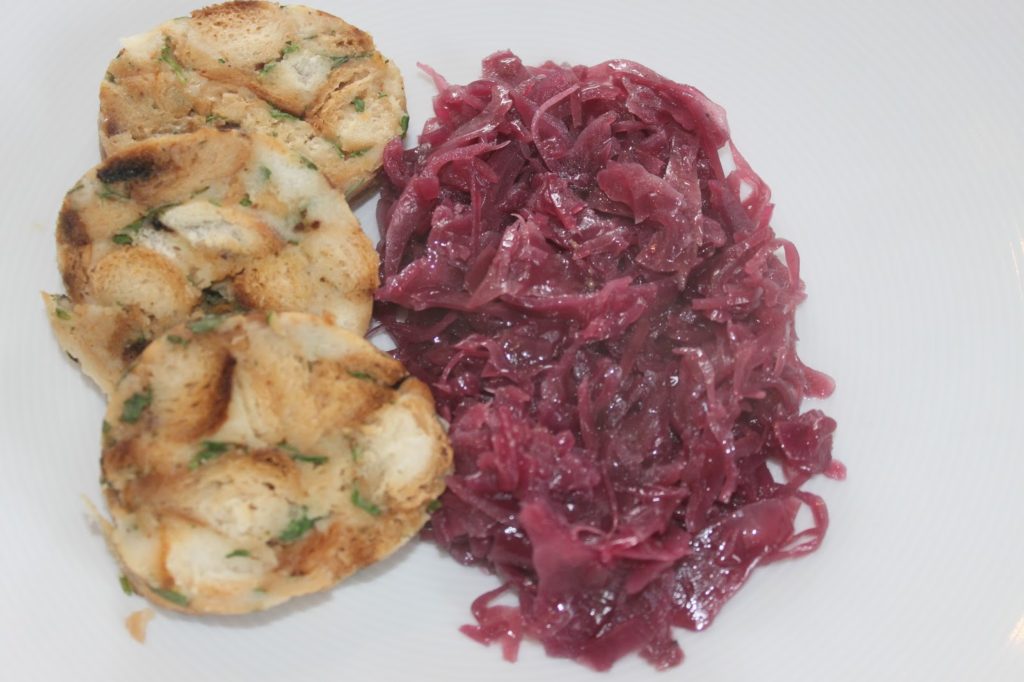 Pour le chou, voici le chou rouge utilisé. On pourra aussi prendre du chou rouge frais. Il en faudra un petit et le couper en lanières. En le faisant cuire avec un couvercle et une cuillerée à soupe de vinaigre de cidre, cela vous donnera presque la même chose !
