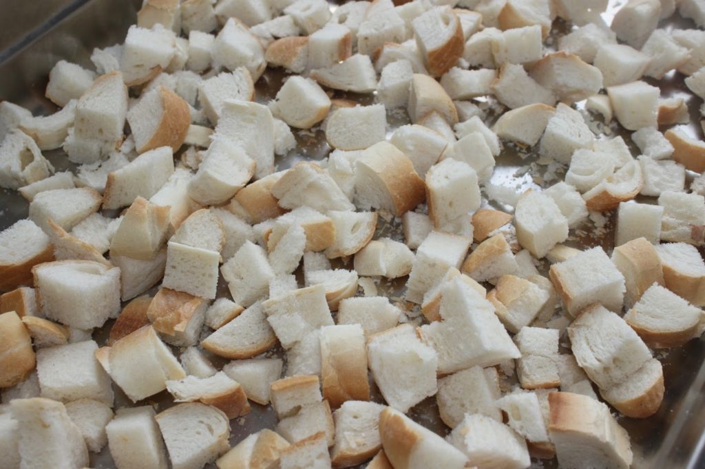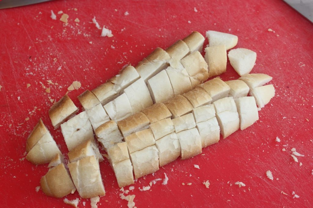 - Laissez cuire sur feu doux. Pendant ce temps, préparez les knödels. Coupez le pain en morceaux.
