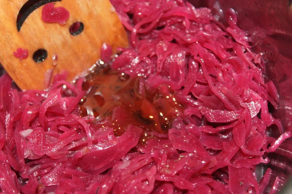 - Pour le chou, voici le chou rouge utilisé. On pourra aussi prendre du chou rouge frais. Il en faudra un petit et le couper en lanières. En le faisant cuire avec un couvercle et une cuillerée à soupe de vinaigre de cidre, cela vous donnera presque la même chose !