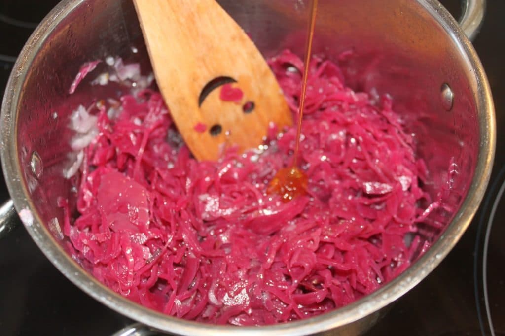 Vous pouvez ajouter dans le chou, un peu de jus de cuisson du porc.