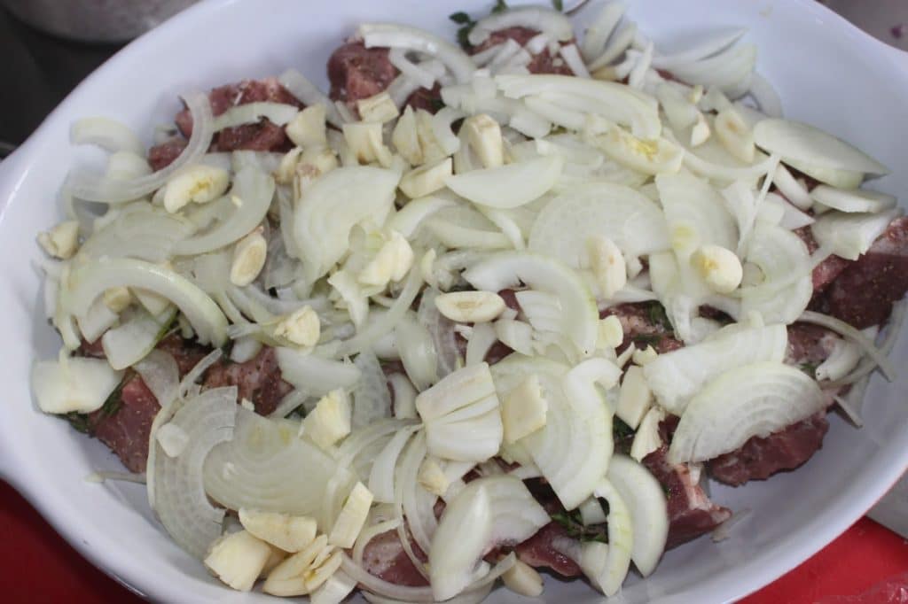 - Couvrez bien avec les oignons épluchés et émincés, ainsi que l’ail coupé en morceaux,