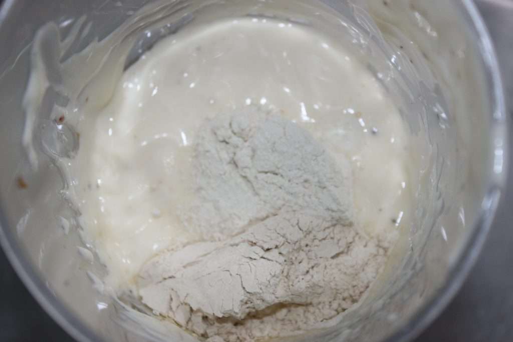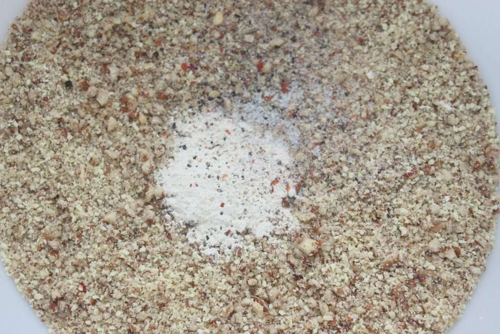 - Ajoutez la poudre de noix de pécan, la cuillerée à café d’ail en poudre, du sel et du poivre. J’ai mis aussi un peu de piment.