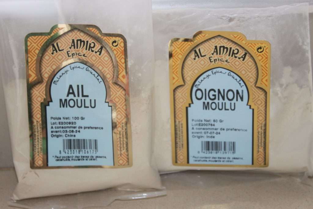 - Voici l’ail et l’oignon en poudre. Ce n’est donc pas de l’ail ou oignon en semoule !