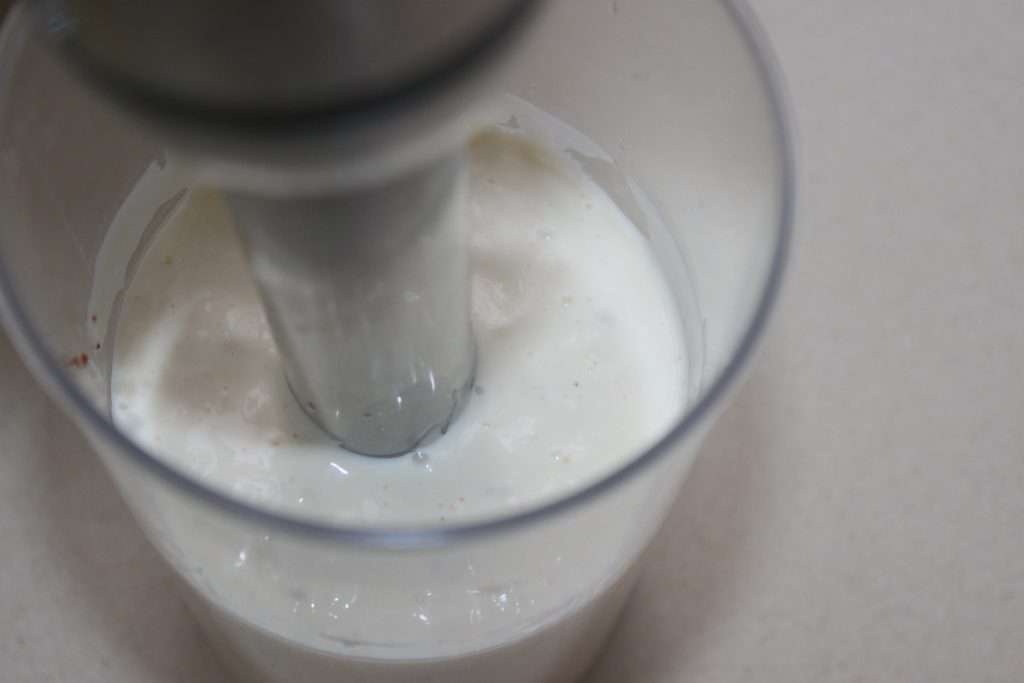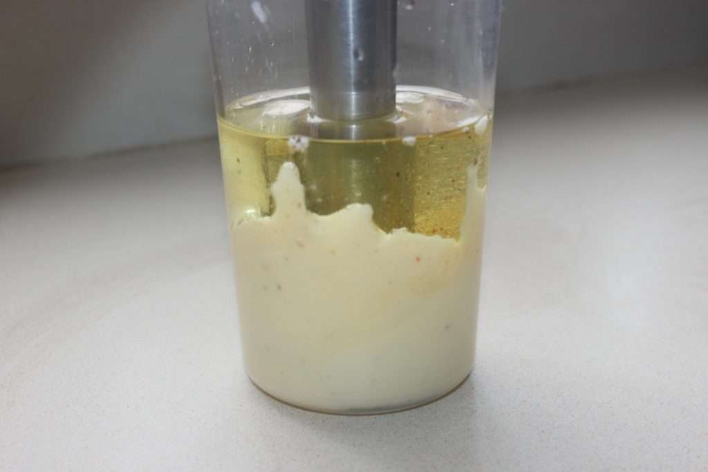 - Mixez en partant du fond puis remontez très doucement pour émulsionner la sauce qui s’épaissit.