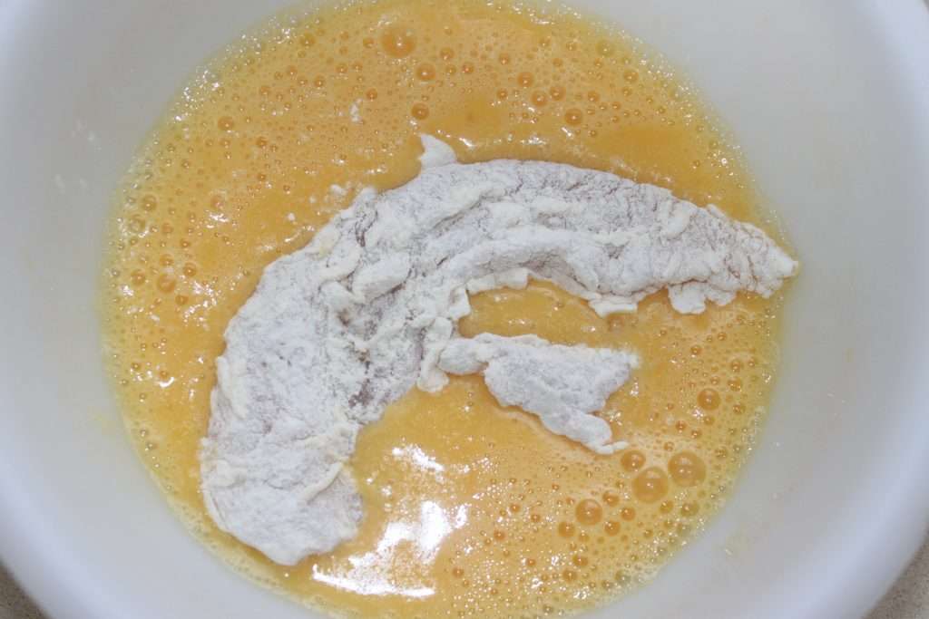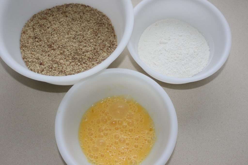 Poner los dos huevos batidos en un segundo bol y la harina en un tercero.