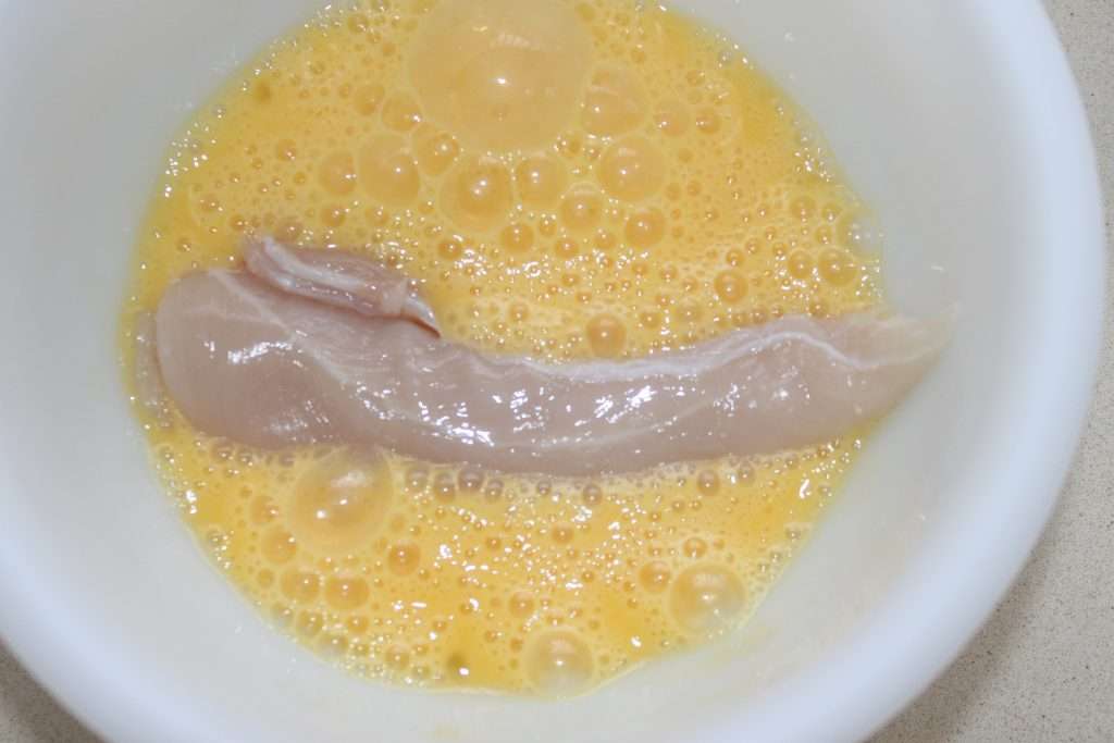 - Placez une aiguillette de poulet dans l’œuf battu.