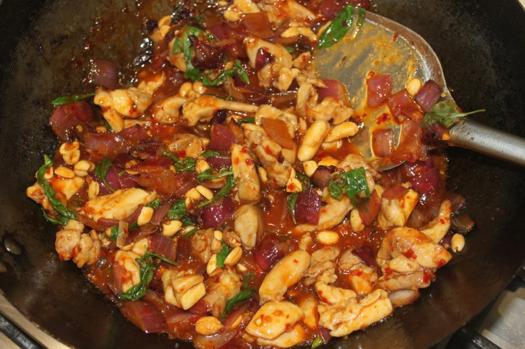 - Mélangez bien et faites cuire 3-4 minutes. Faites attention à ce que le tout ne brûle pas ! Ajoutez alors les feuilles de basilic thaï et les cacahuètes.
