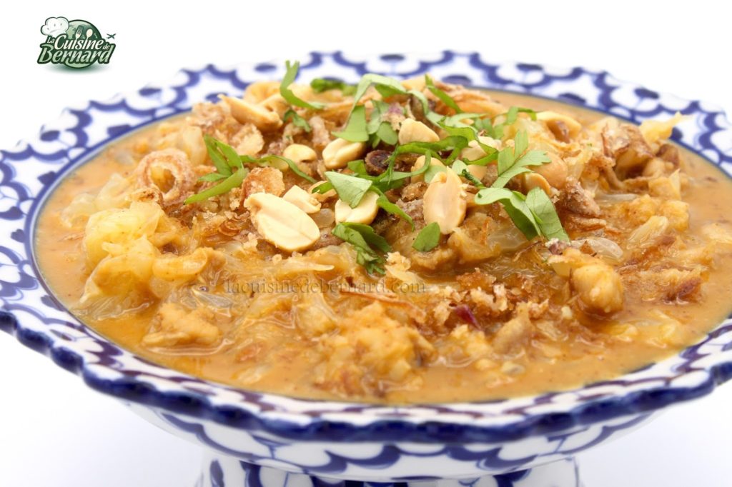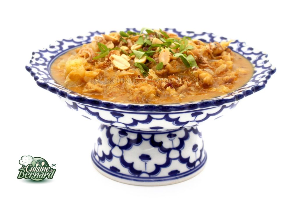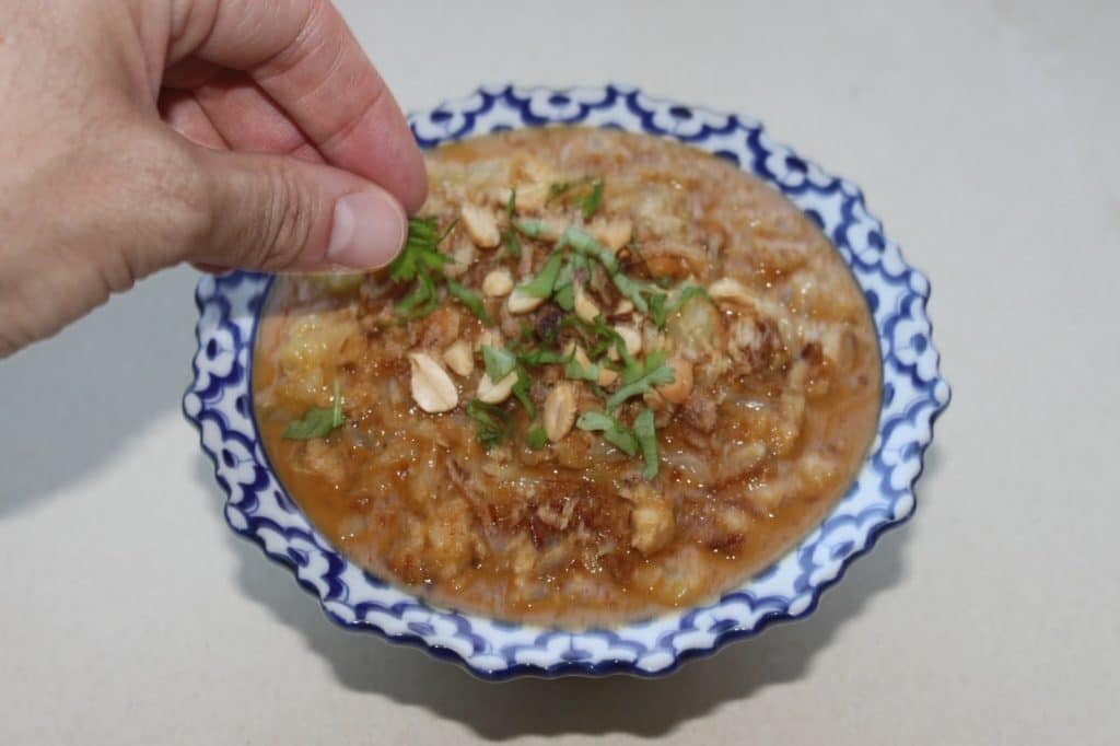 Versez dans un plat, ajoutez quelques oignons frits, des cacahuètes et de la coriandre. Servez immédiatement et dégustez à la cuillère !