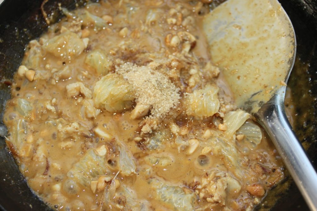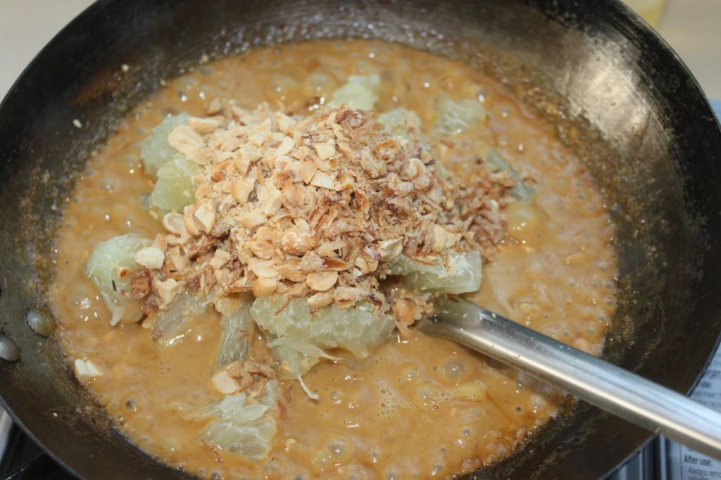 Ajoutez le pomelo, les oignons frits et les cacahuètes hachées quand le poulet a une apparence cuite.
