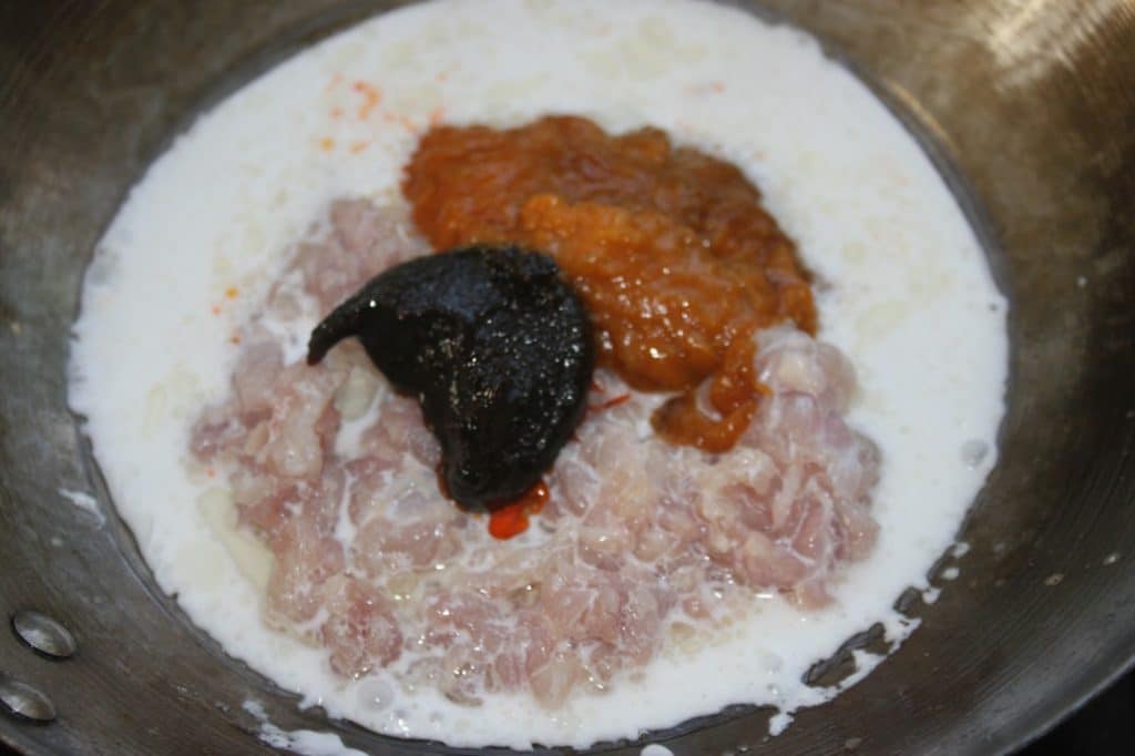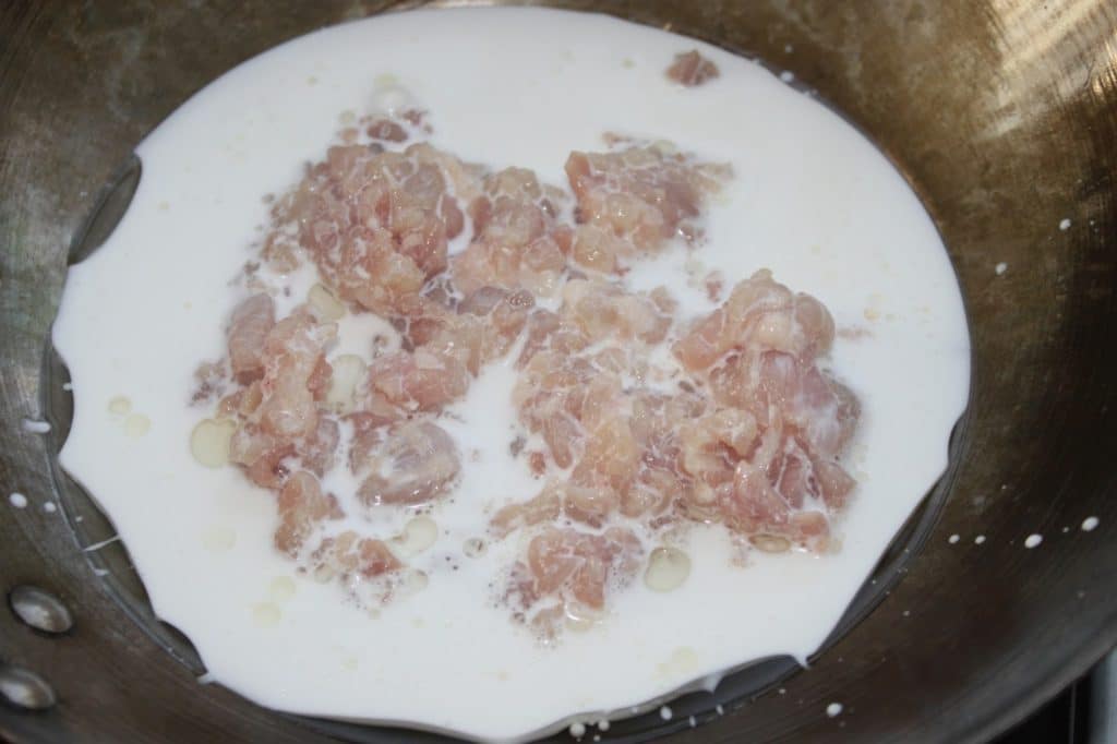 Mettez une cuillerée à soupe d’huile, le lait de coco et le poulet haché dans le wok sur feu assez vif.