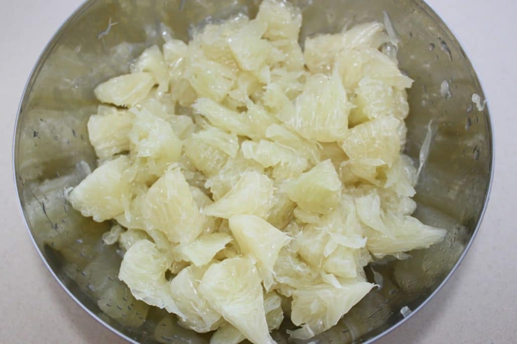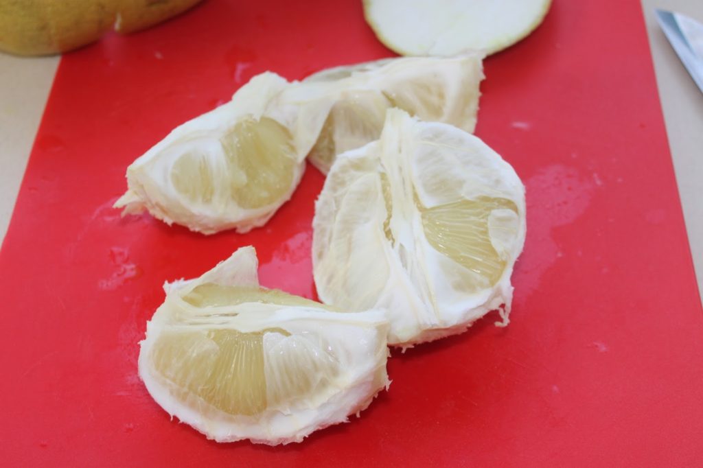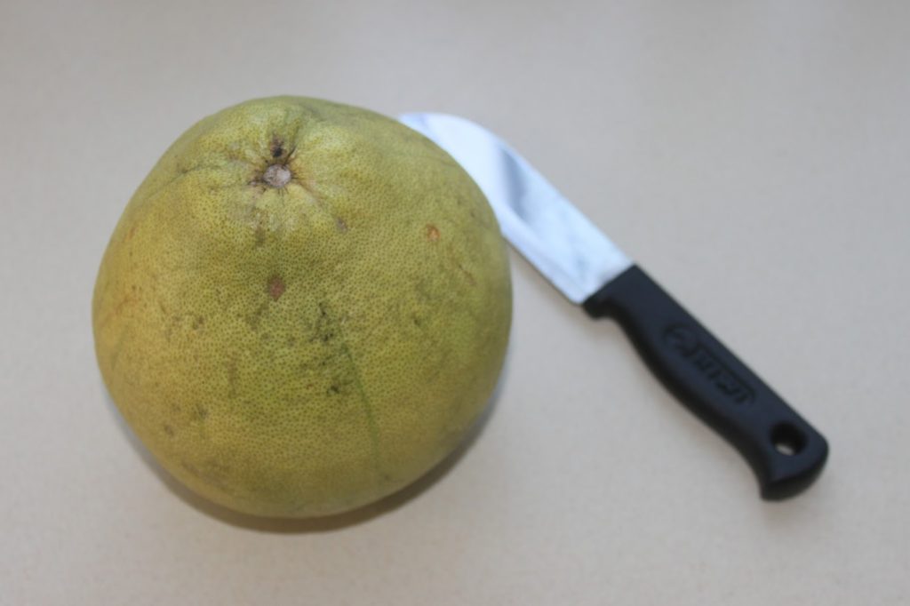 Ouvrez tout d’abord votre pomelo. Préférez pour cette recette, un pomelo à chair jaune.