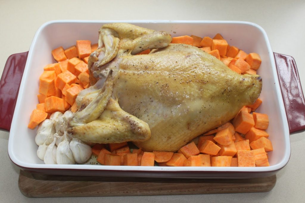 - Placez le plat au four à froid puis mettez à 180°C sans préchauffage pour 1h15 au total. Mais on va y revenir au bout de 30 minutes pour y ajouter les patates douces.