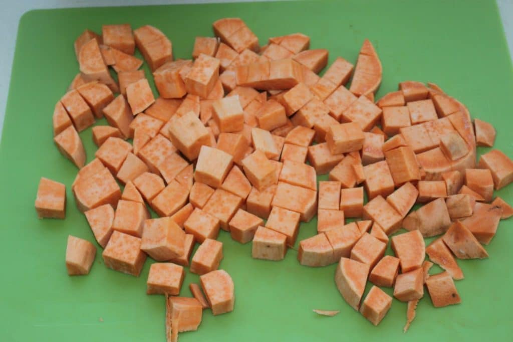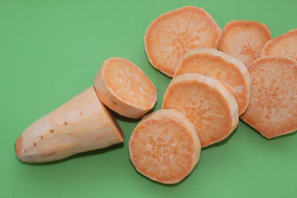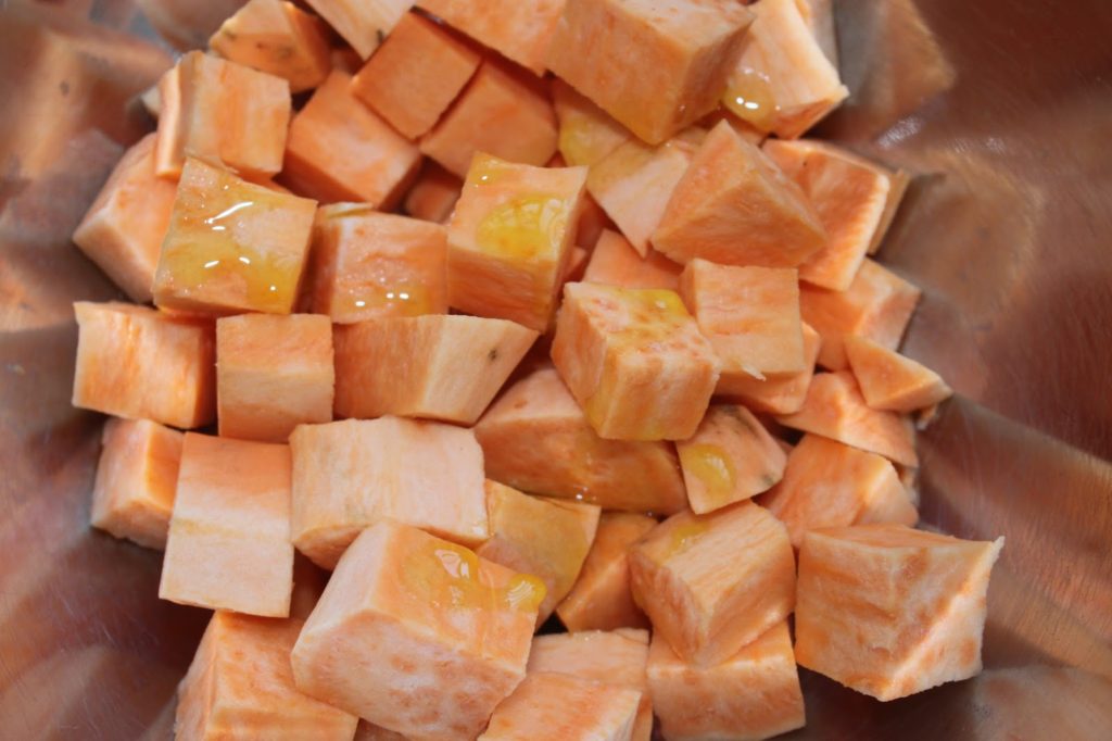 - Épluchez et coupez en morceaux les patates douces.