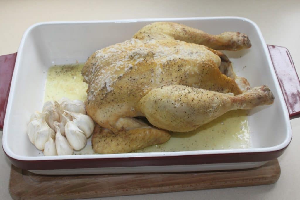 - Placez le poulet dans un plat allant au four. Arrosez-le d’huile d’olive puis massez-le bien, même en dessous. Salez et poivrez-le de tous les côtés. Placez un peu de beurre sur le dessus. Mettez la tête d’ail entière partiellement épluchée avec un peu d’huile d’olive.