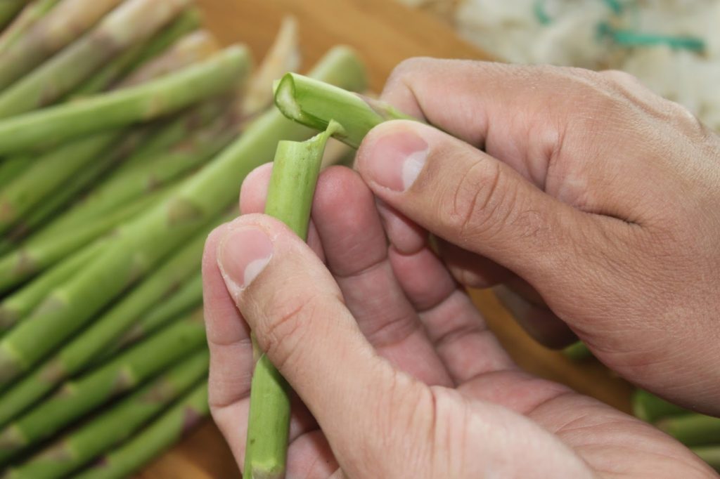 - Cela va naturellement casser au bon endroit. En général le pied est plus mou, sauf sur les asperges qui viennent d’être cueillies. En les cassant, vous vous débarrassez de la partie moins bonne. Essayez d’être le plus près du pied pour en perdre le moins possible.