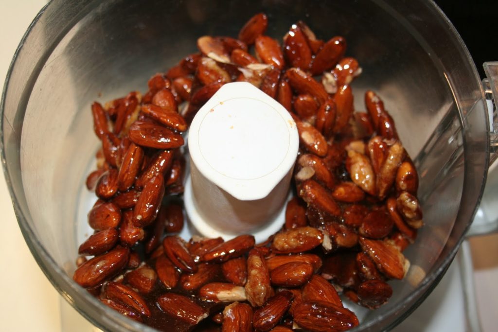 ¨Pour un praliné en pâte, laisser tourner le mixer jusqu’à obtenir une consistance presque liquide. Cela dépend de la puissance du mixer de chacun. Voici les photos de toutes les étapes succésives. Mais il ne faut pas douter que l’on peut obtenir une pâte à partir d’éléments secs et durs!! Plus on laissera le tout dans le mixer en marche, plus la pâte sera broyée.