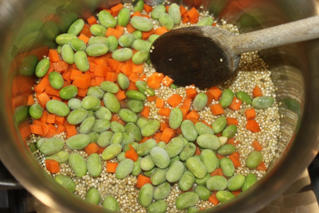 Au bout de 7 minutes de cuisson du quinoa, ajoutez les légumes et un peu plus de bouillon.