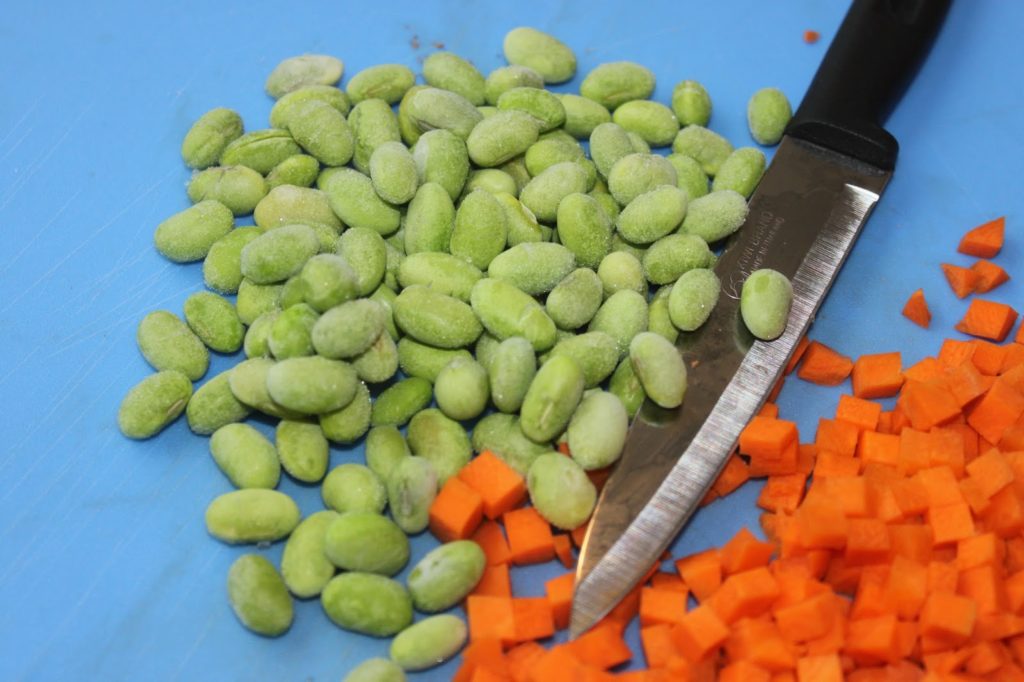- Pour cette recette, j’ai mis des edamames. J’adore ça ! J’en suis complètement accro… Mais vous pouvez soit les oublier, soit mettre des fèves pelées ou encore des petits pois frais ou surgelés.