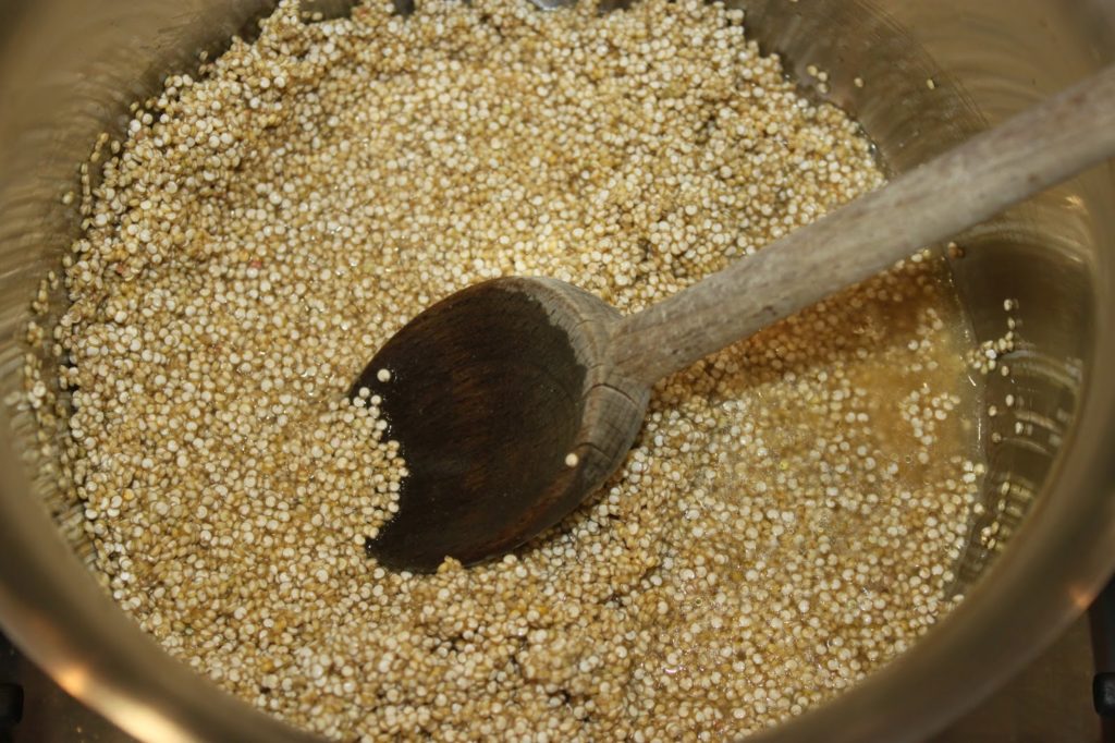 - Dans une casserole, versez l’huile d’olive sur feu modéré et ajoutez le quinoa.