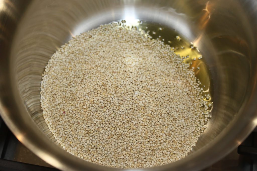 Dans une casserole, versez l’huile d’olive sur feu modéré et ajoutez le quinoa.