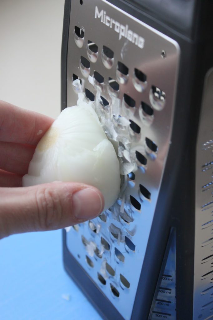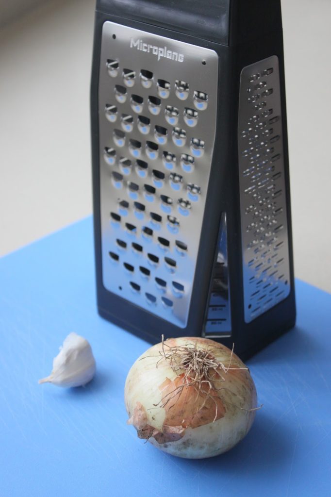 - Commencez par râper l’oignon. Vous pouvez bien sûr le couper très finement au couteau.
