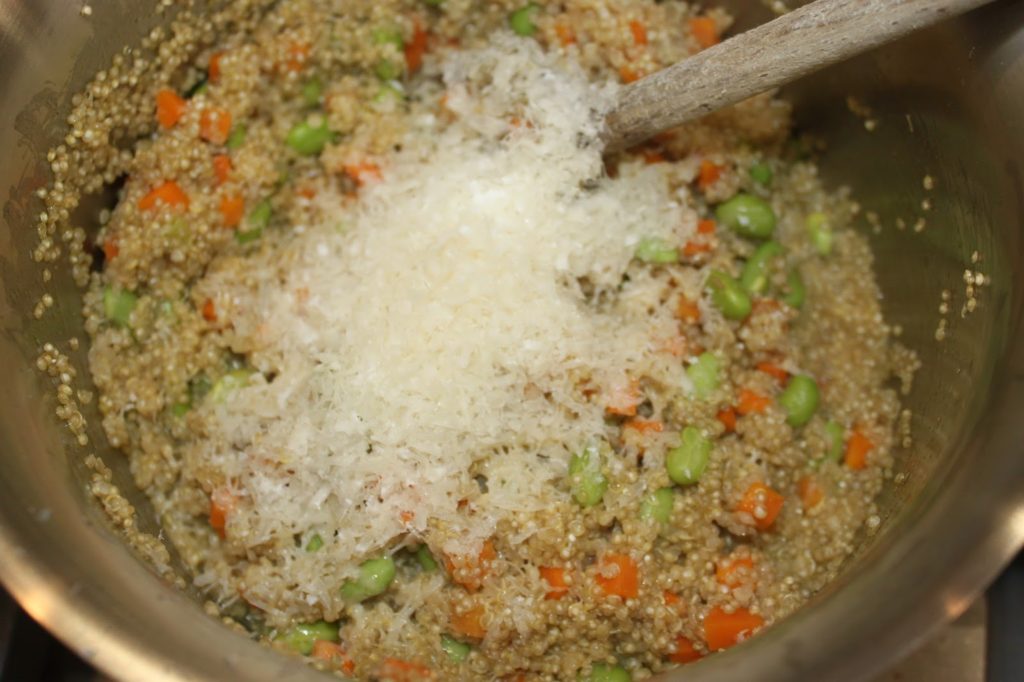 - Quand vous arrivez au bout de cuisson du quinoa et que vous avez versé tout le bouillon, râpez le parmesan.