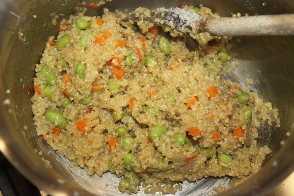 - Au bout de 7 minutes de cuisson du quinoa, ajoutez les légumes et un peu plus de bouillon.