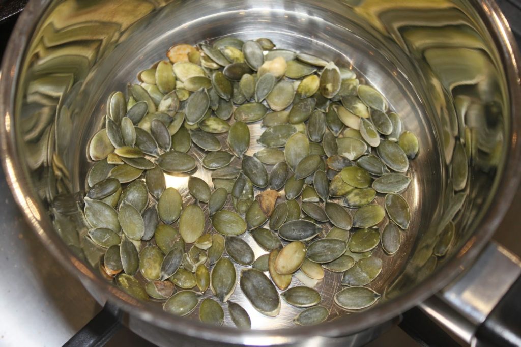 - Pendant ce temps dans une petite poêle, faites griller légèrement les graines de courges. La peau doit commencer à craqueler.