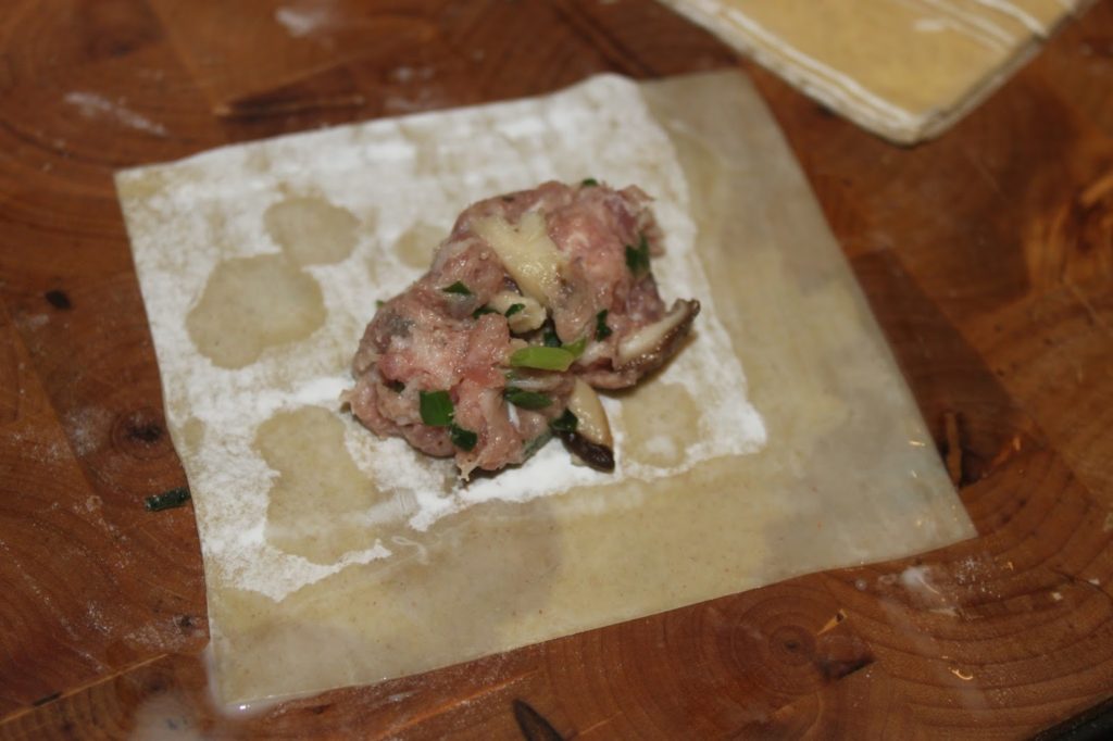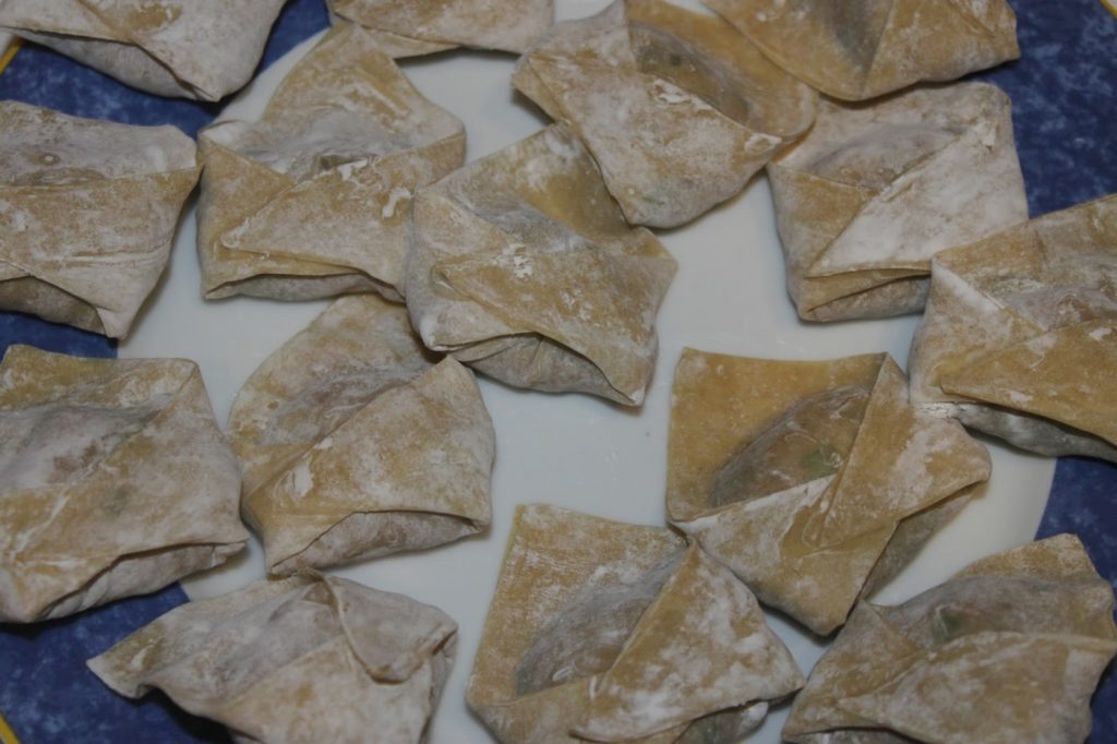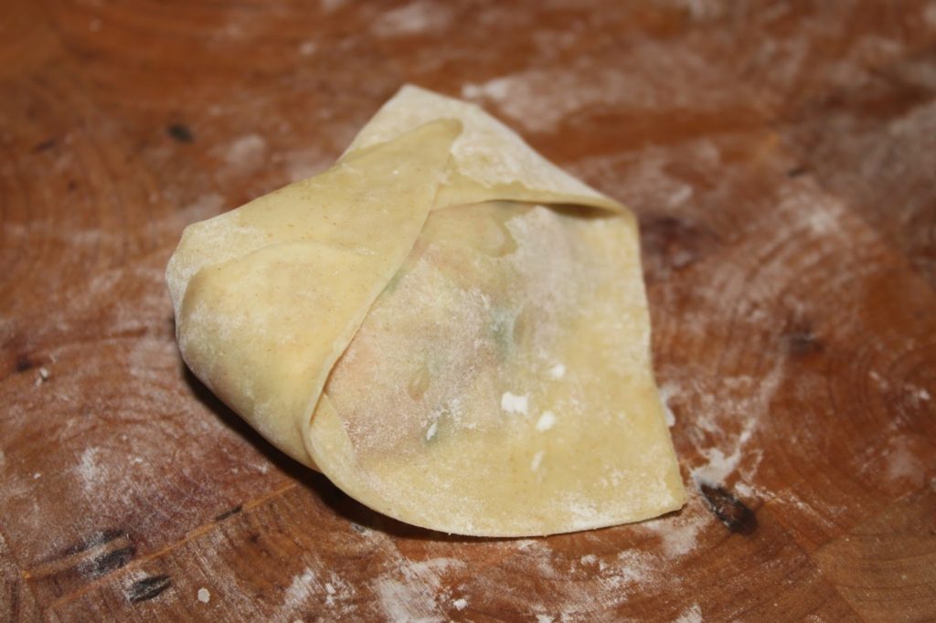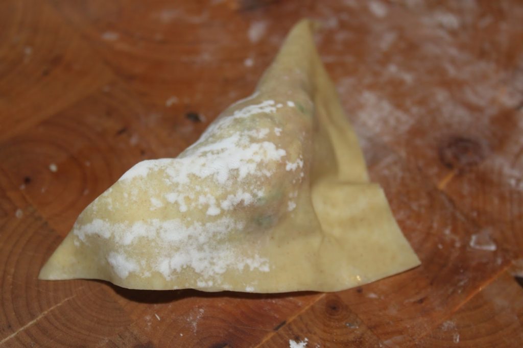 - Mettez une bonne cuillerée à café de farce au centre d’un carré de pâte. Humidifiez la pâte sur deux des côtés, puis rabattez un coin pour former un triangle.