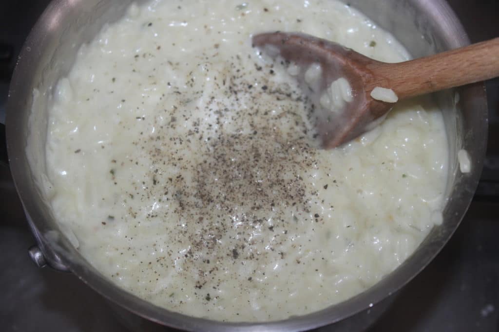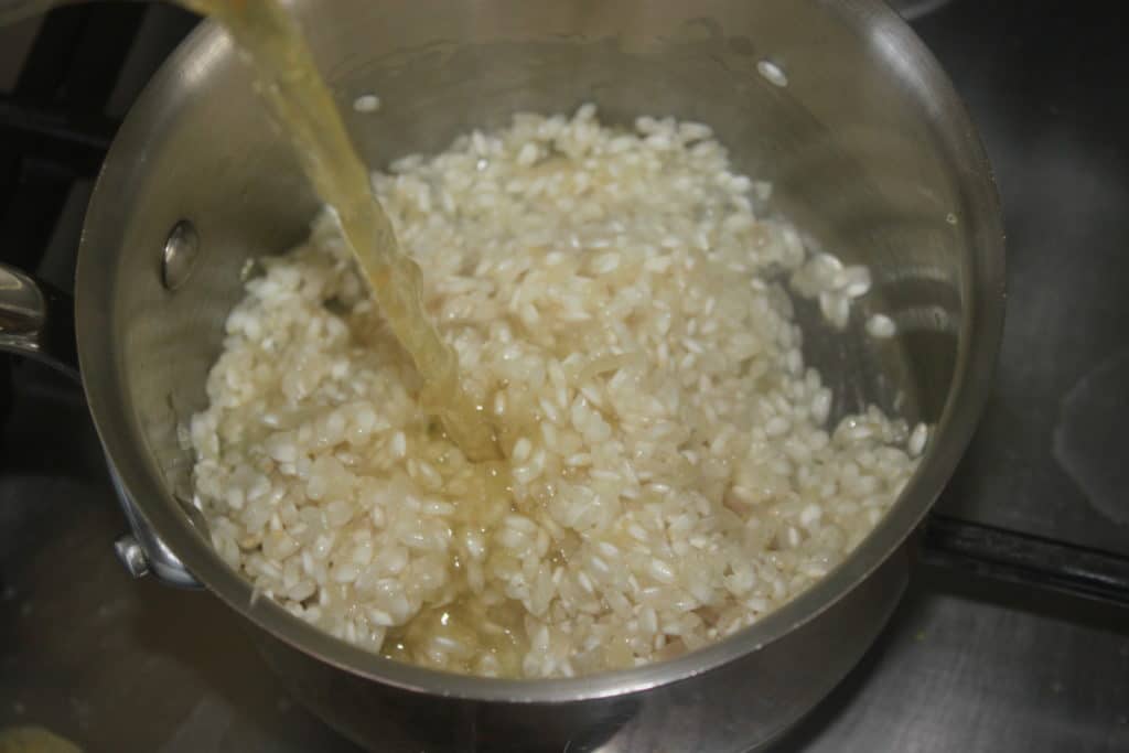 Versez alors un bon tiers du bouillon puis laissez-le s’absorber en mélangeant de temps en temps. Ajoutez le reste du bouillon encore en deux fois. Cela va prendre en gros 20 minutes.