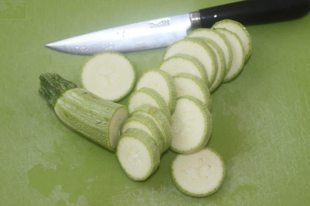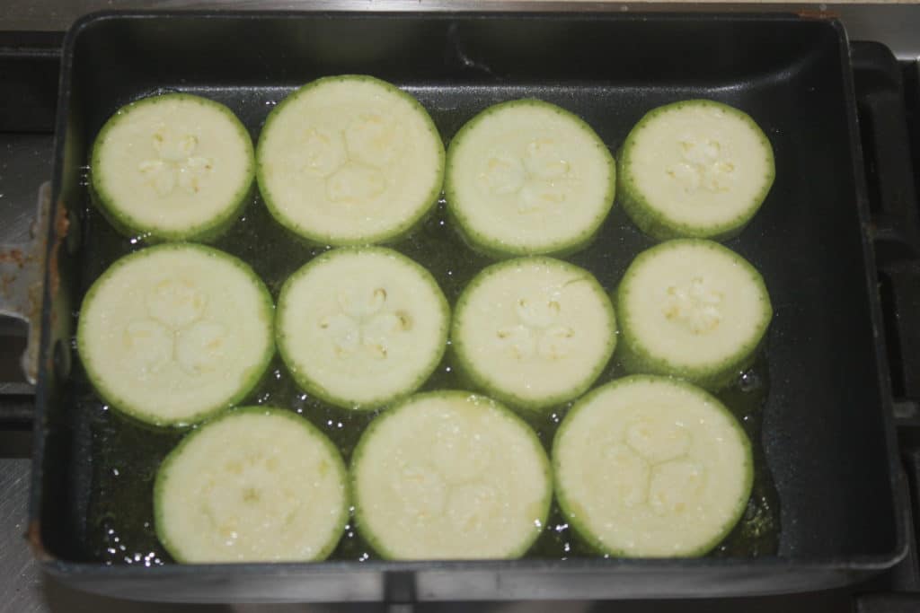 Pendant ce temps coupez les courgettes en tranches puis faites-les sauter dans une poêle avec de l’huile d’olive sur feu assez soutenu.