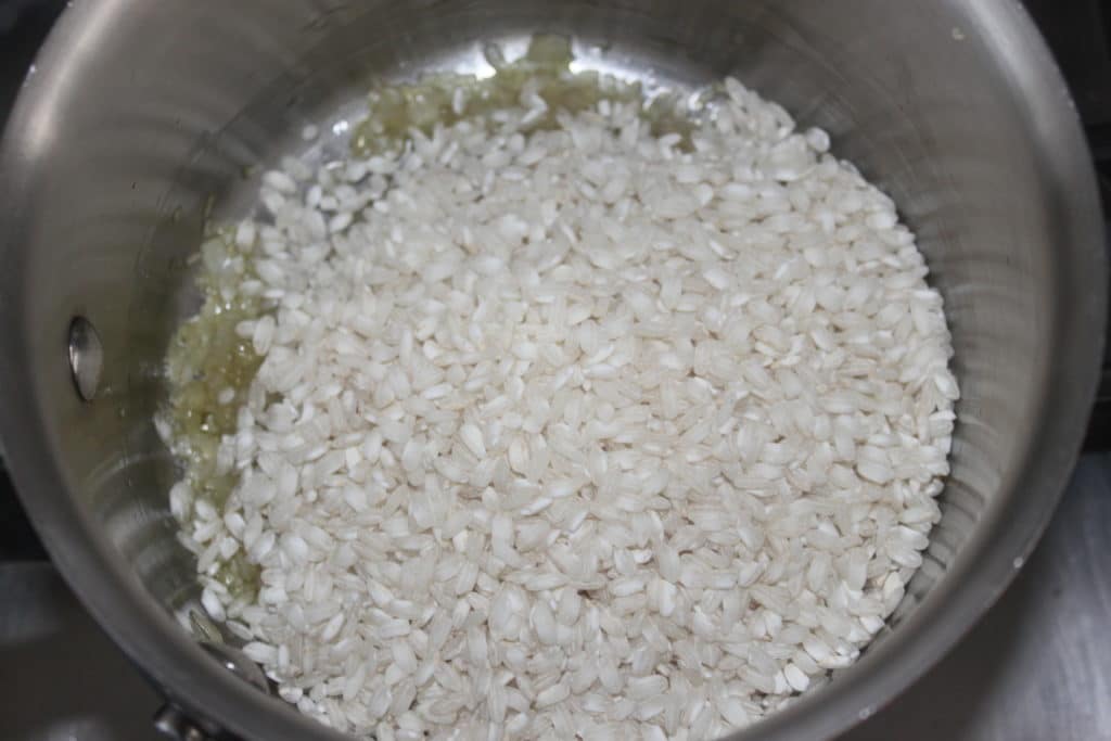 Laissez cuire 5 minutes sur feu doux puis versez le riz.