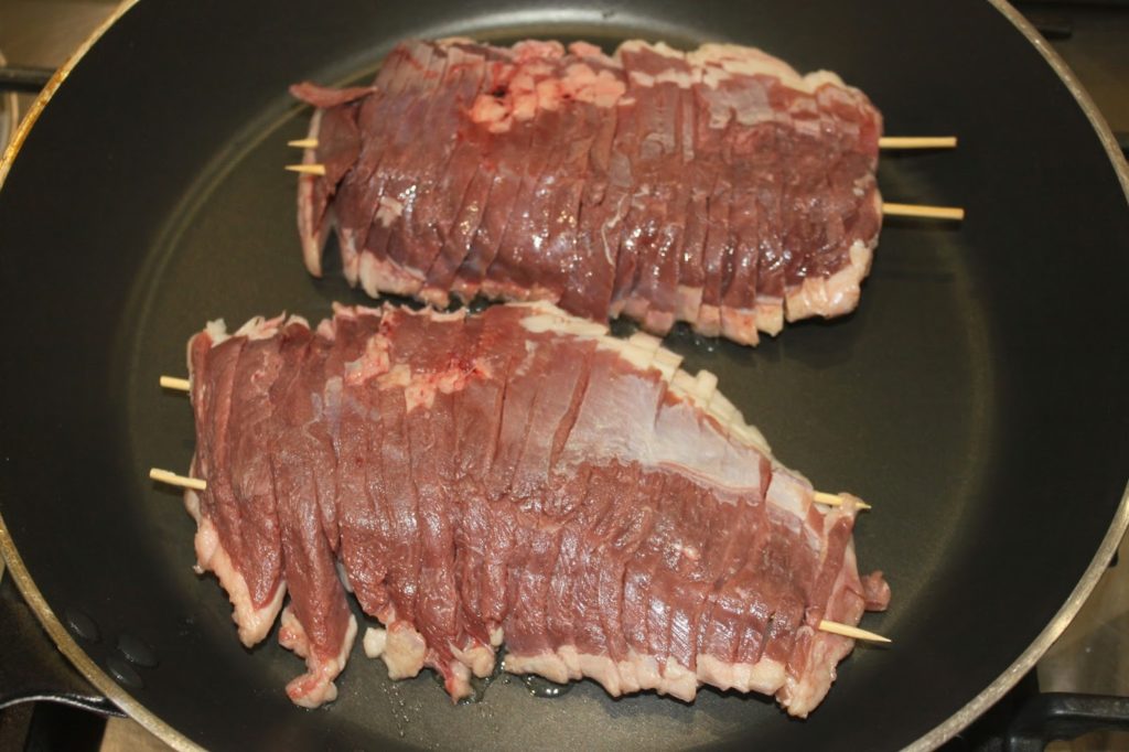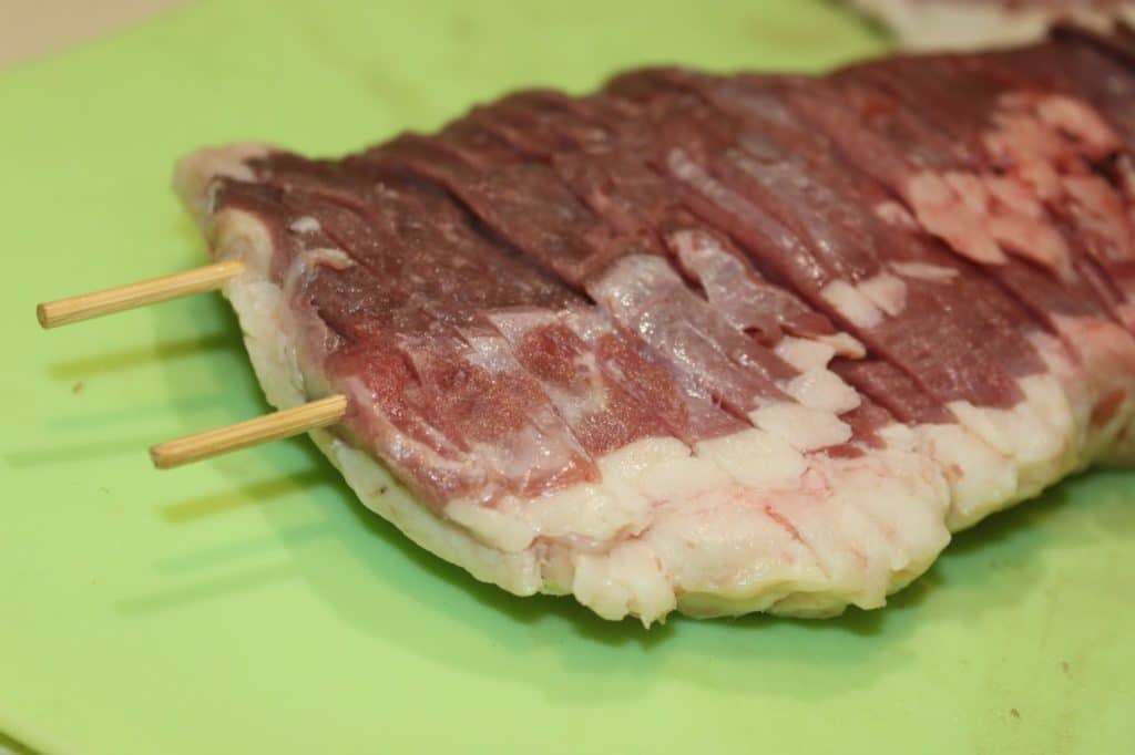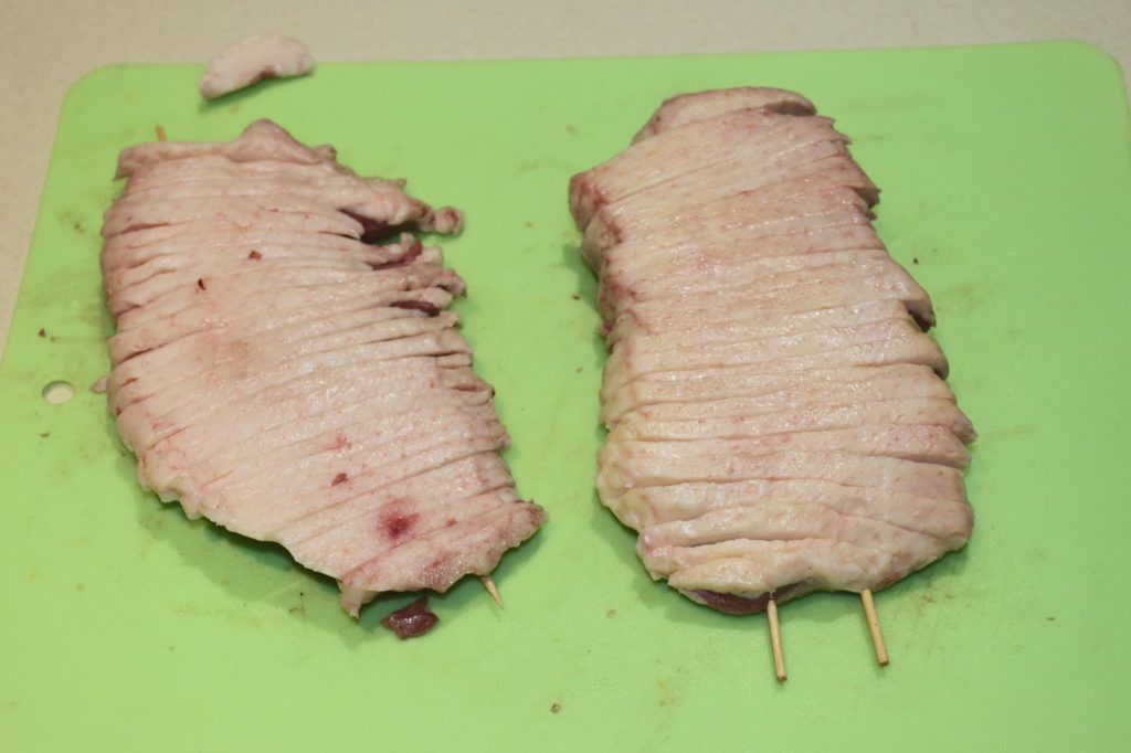 - Plantez deux pics à brochette en bois pour maintenir fermement le magret.