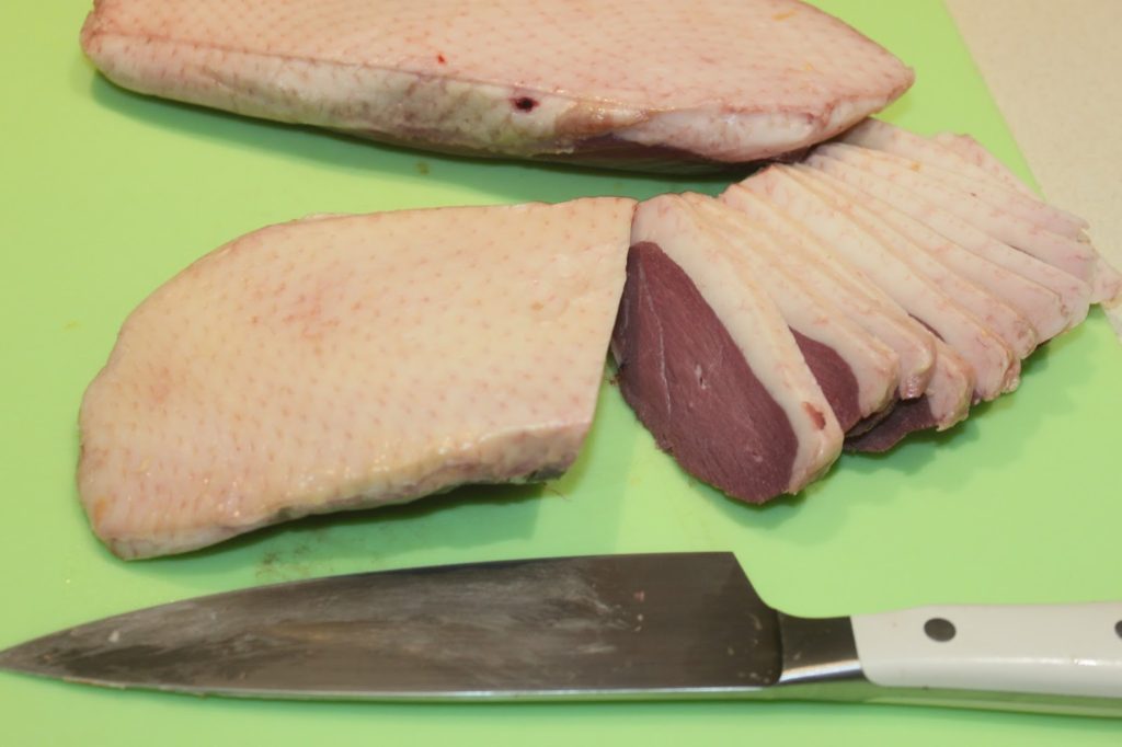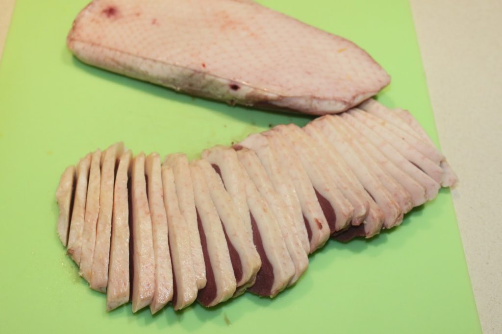 - En milieu de parcours du risotto, sortez les magrets du congélateur. Ils sont maintenant durs, et vous pouvez les couper très finement avec un bon couteau.