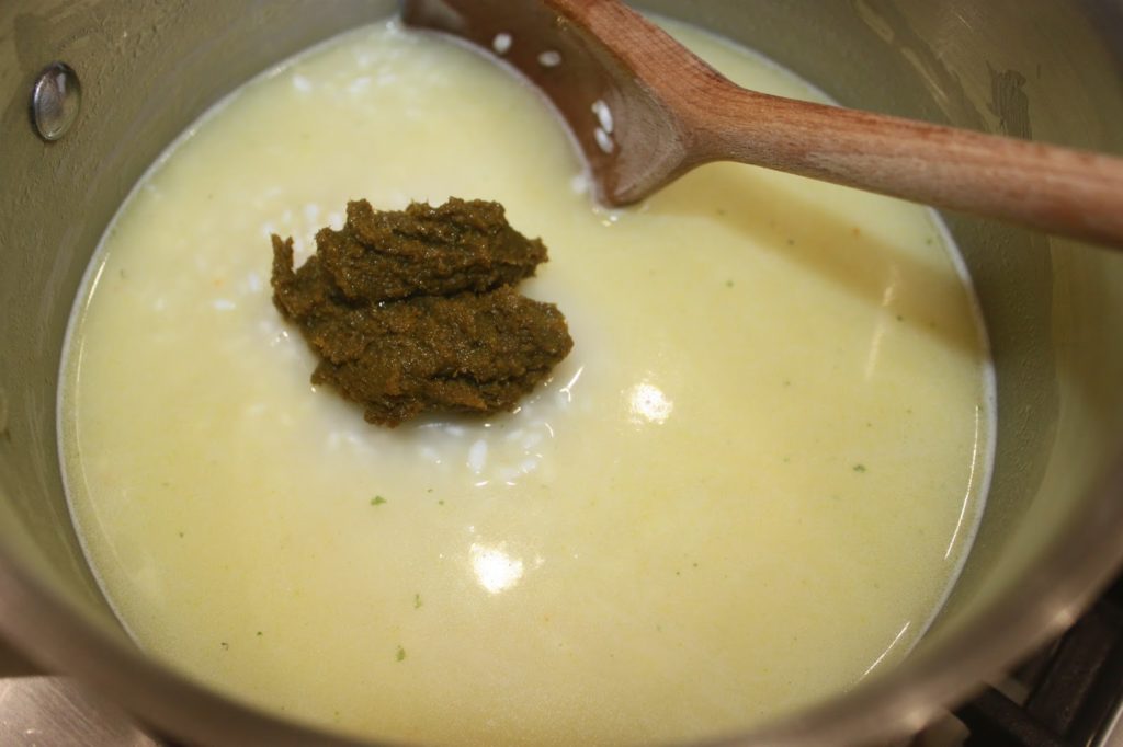 - Ajoutez la pâte de curry vert. Je n’en mets que deux cuillerées à café. Mais libre à vous d’en mettre plus ou moins. Il vaut mieux en mettre peu, pour en ajouter à la fin.