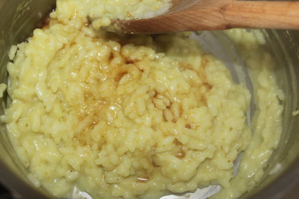 Cuando se absorba el caldo, vierta más y así sucesivamente hasta que se utilice todo el caldo. Se tarda unos 20 minutos.