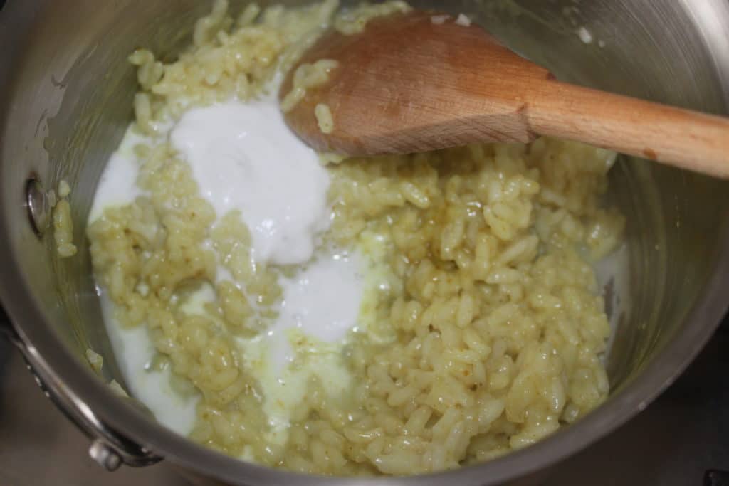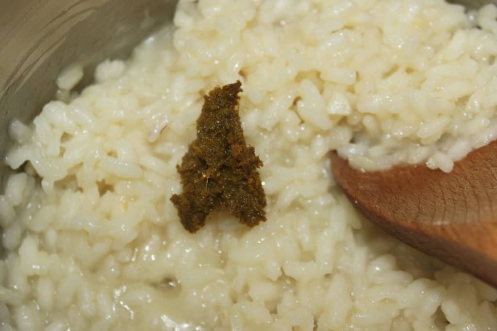 Cuando haya añadido todo el caldo al risotto, añada la pasta de curry verde.