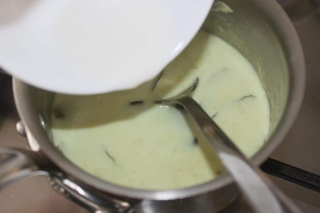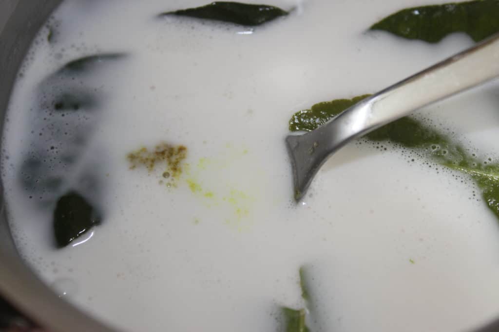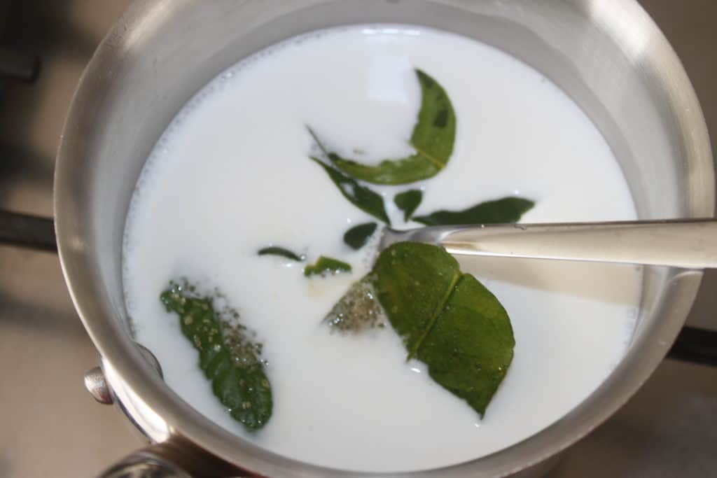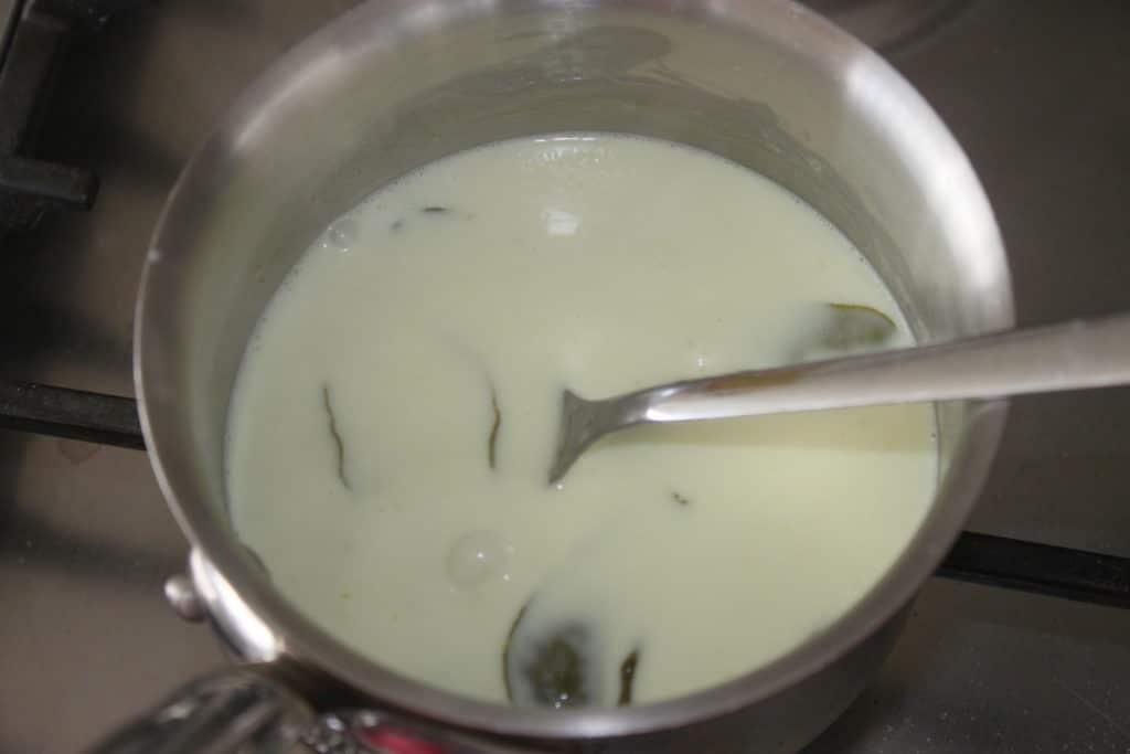 Mientras tanto, prepare la crema de coco al curry verde. Vierta la leche de coco, el azúcar, el nuoc mam y las hojas de combava en una cacerola.