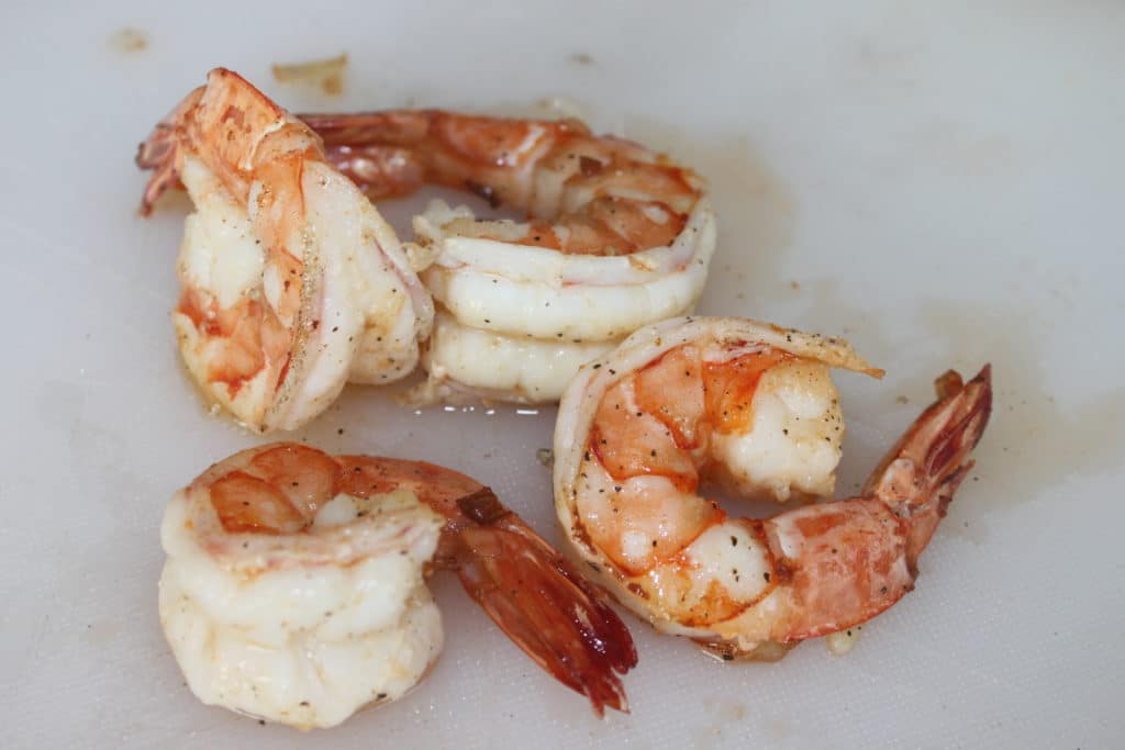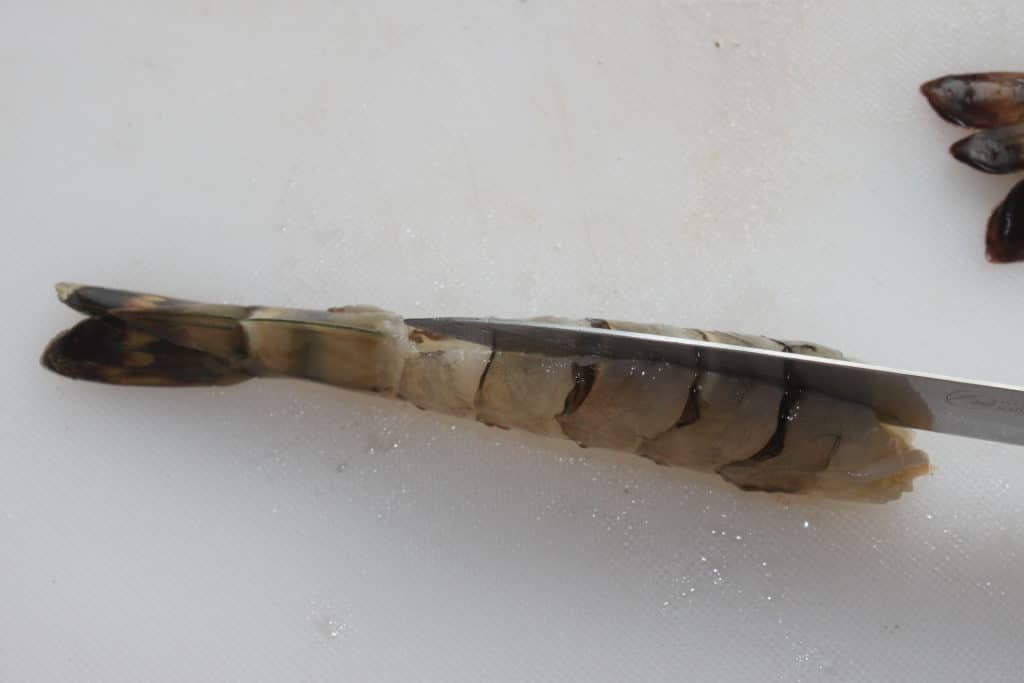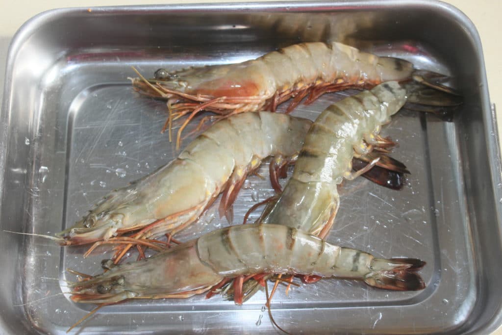 Preparar las gambas. Quitar la cabeza y el caparazón, dejando sólo la punta de la cola.