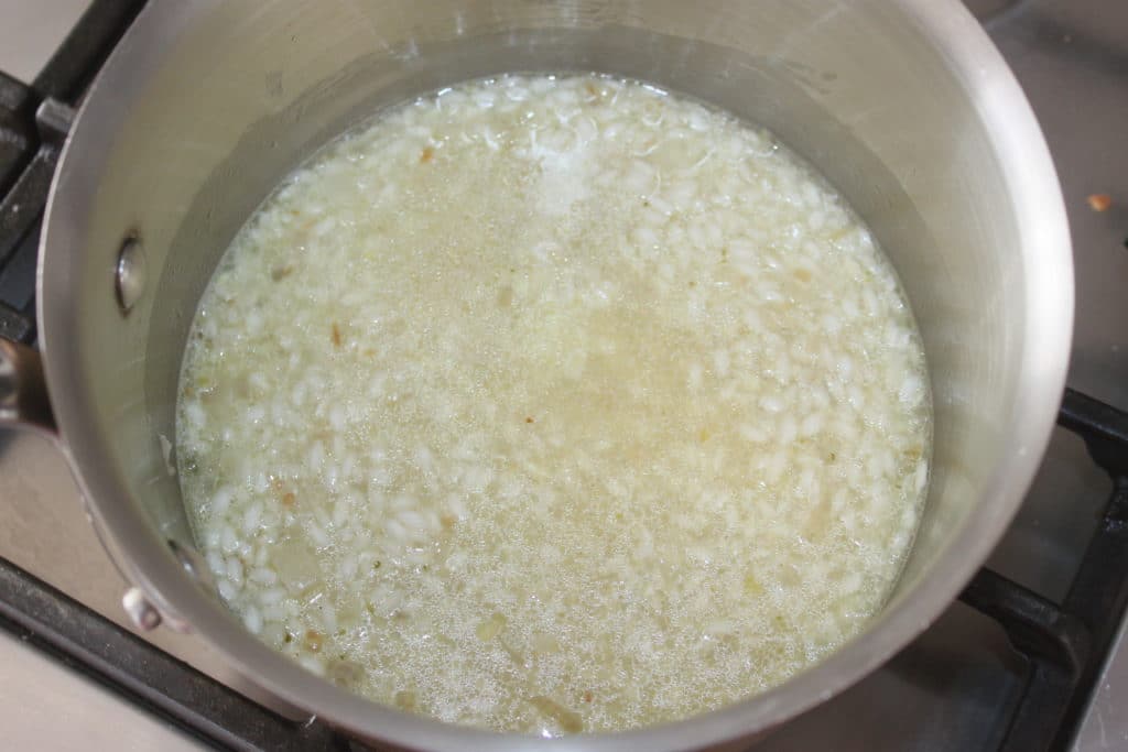 Vierta el vino blanco y deje que el arroz lo absorba. A continuación, vierta un buen tercio del caldo. Deja que se cocine a fuego lento.