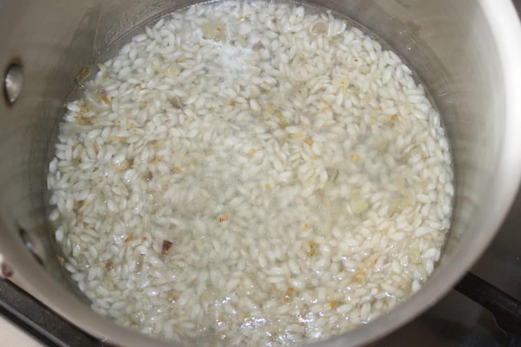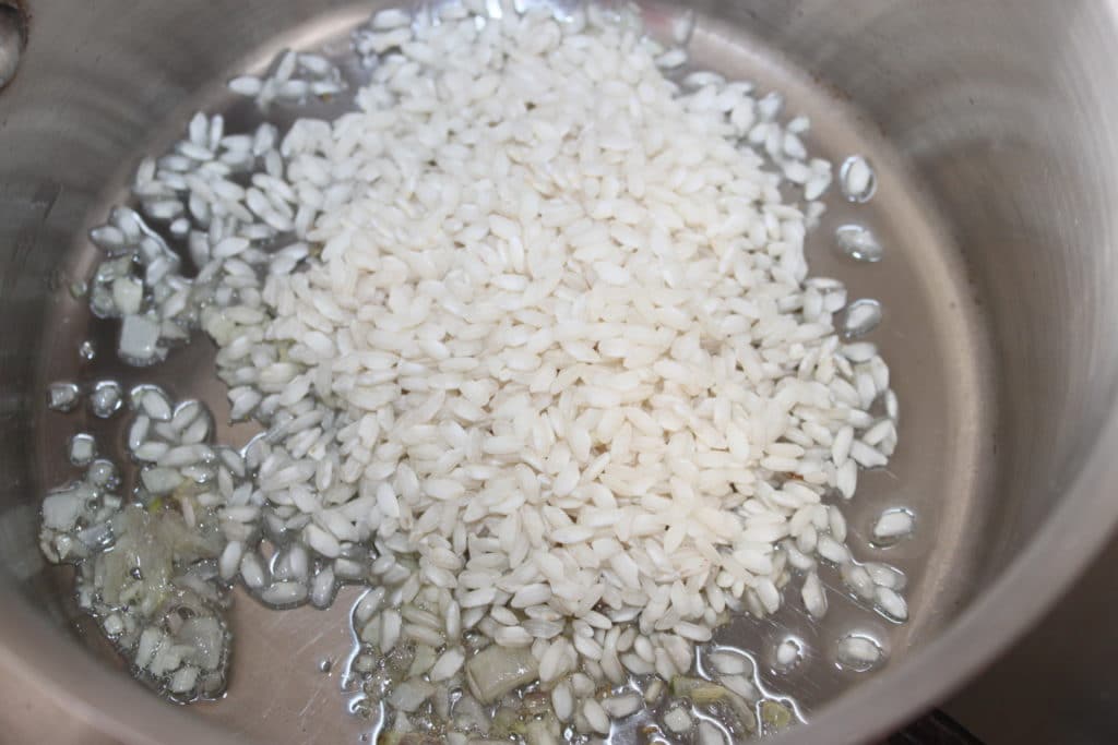 Añadir el arroz y cocerlo durante 3 minutos para que se impregne de grasa.