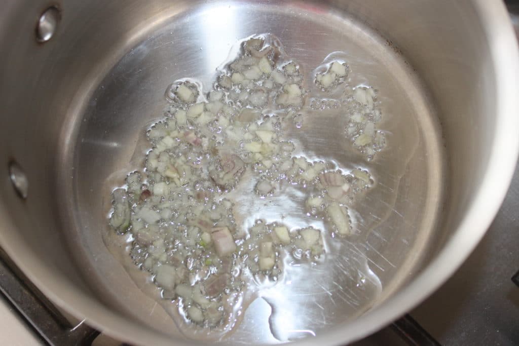 Empiece con su risotto. Poner el aceite, el ajo y la chalota en una sartén a fuego moderado.