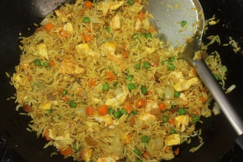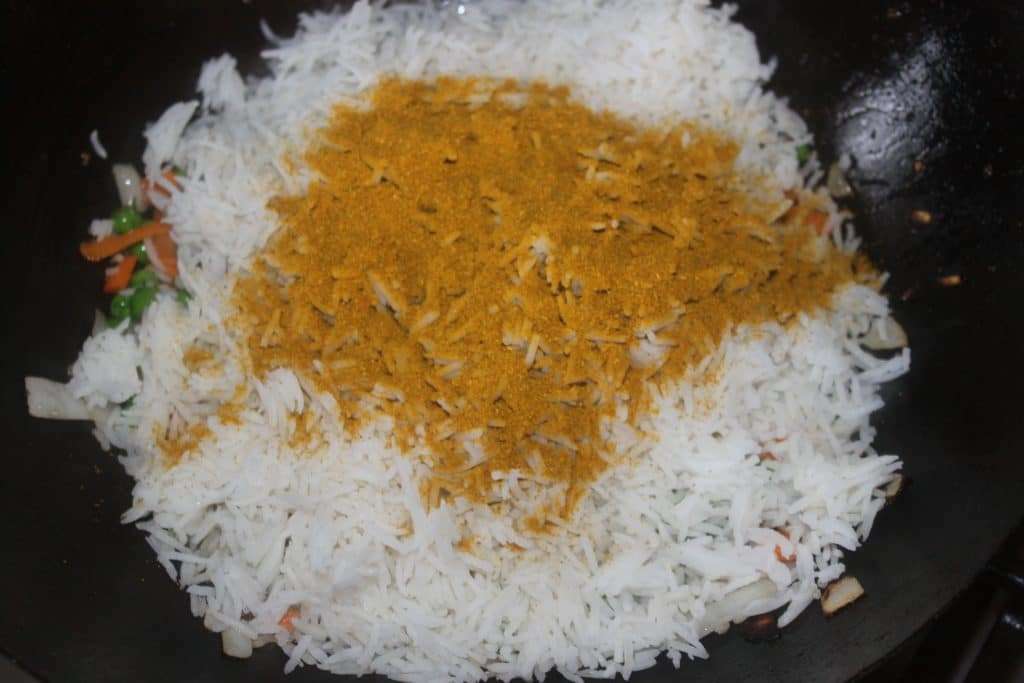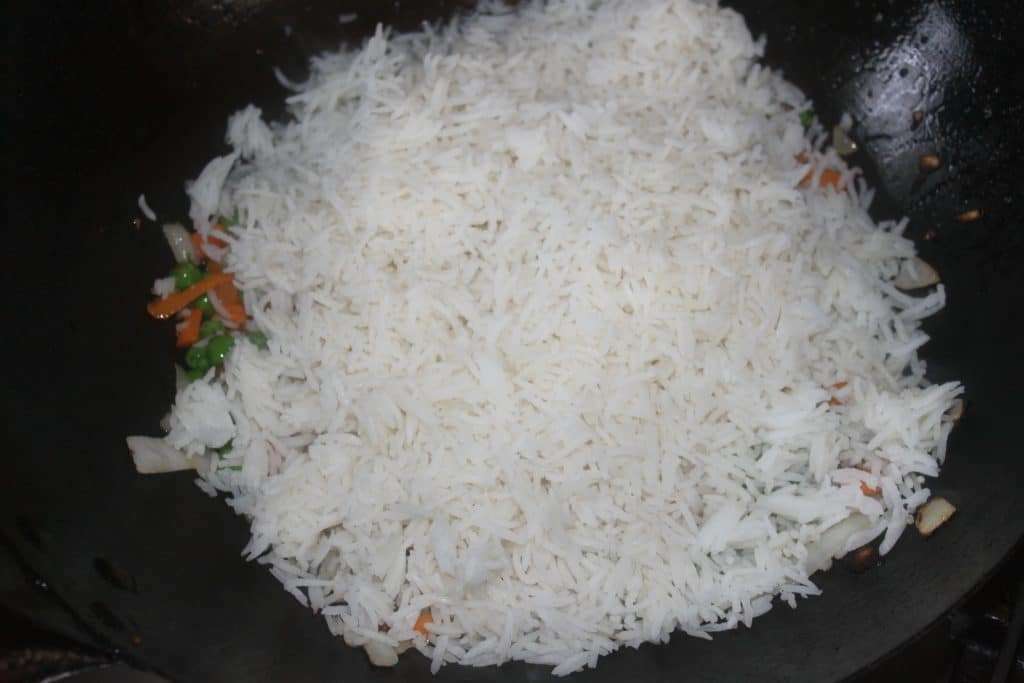 - Quand l’oignon et la carotte ont un air cuit, ajoutez le riz cuit.