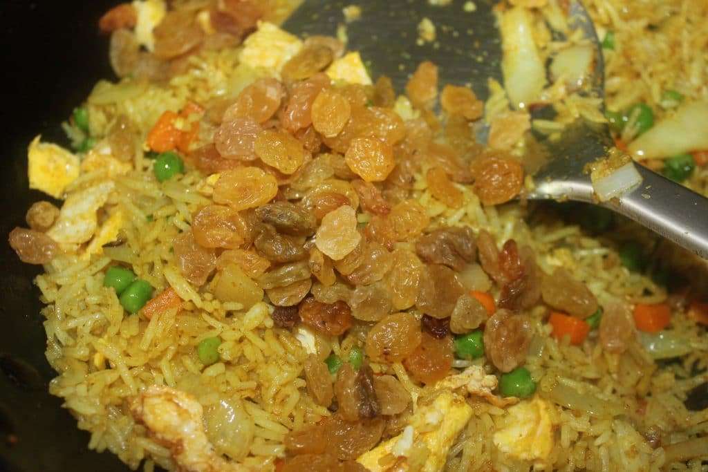 Riz sauté au curry, raisins et légumes
